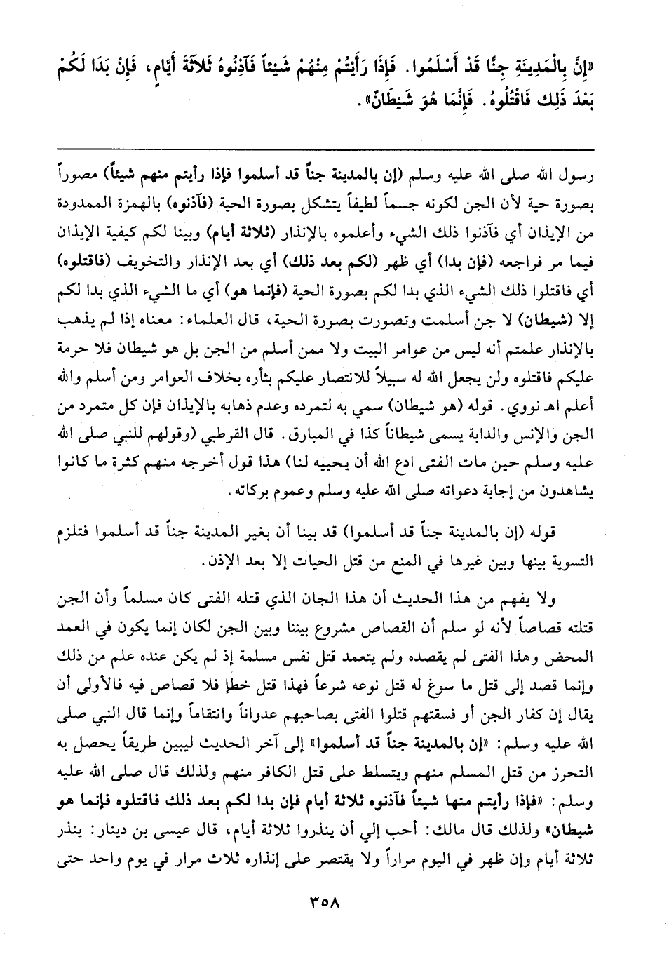 "إِنَّ بِالْمَدِينَةِ جِنًّا قَدْ أَسْلَمُوا. فَإِذَا رَأَيتُمْ مِنْهُمْ شيئًا فَآذِنُوهُ ثَلاثَةَ أَيَّامٍ، فَإِنْ بَدَا لَكُمْ بَعْدَ ذَلِك فَاقْتُلُوهُ. فَإِنَّمَا هُوَ شَيطَانٌ"