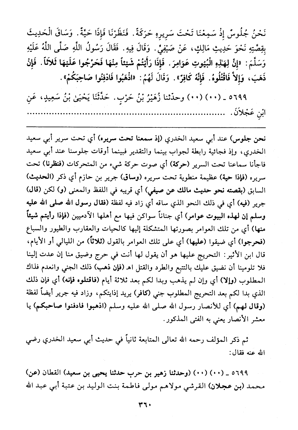 نحن جلوس) عند أبي سعيد الخدري (إذ سمعنا تحت سريره) أي تحت سرير أبي سعيد الخدري، وإذ فجائية رابطة لجواب بينما والتقدير فبينما أوقات جلوسنا عند أبي سعيد فاجأنا سماعنا تحت السرير (حركة) أي صوت حركة شيء من المتحركات (فنظرنا) تحت سريره (فإذا حية) عظيمة منطوية تحت سريره (وساق) جرير بن حازم أي ذكر (الحديث) السابق (بقصته نحو حديث مالك عن صيفي) أي قريبه في اللفظ والمعنى (و) لكن (قال) جرير (فيه) أي في ذلك النحو الذي ساقه أي زاد فيه لفظة (فقال رسول الله صلى الله عليه وسلم إن لهذه البيوت عوامر) أي جنانًا سواكن فيها مع أهلها الآدميين (فإذا رأيتم شيئًا منها) أي من تلك العوامر بصورتها المتشكلة إليها كالحيات والعقارب والطيور والسباع (فحرجوا) أي ضيقوا (عليها) أي على تلك العوامر بالقول (ثلاثًا) من الليالي أو الأيام، قال ابن الأثير: التحريج عليها هو أن يقول لها أنت في حرج وضيق منا إن عدت إلينا فلا تلومينا أن نضيق عليك بالتتبع والطرد والقتل اهـ (فإن ذهب) ذلك الجني وانعدم فذاك المطلوب (وإلا) أي وإن لم يذهب وبدا لكم بعد ثلاثة أيام (فاقتلوه فإنه) أي فإن ذلك الذي بدا لكم بعد التحريج المطلوب جني (كافر) يريد إذايتكم، وزاد فيه جرير أيضًا لفظة (وقال لهم) أي للأنصار رسول الله صلى الله عليه وسلم (اذهبوا فادفنوا صاحبكم) يا معشر الأنصار يعني به الفتى المذكور.