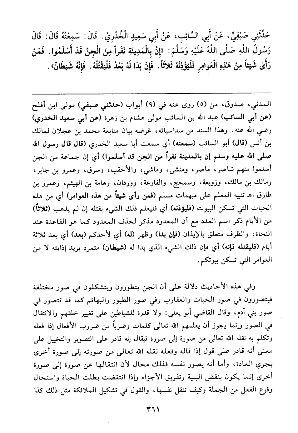 حَدَّثَنِي صَيفِيٌّ، عَنْ أَبِي السَّائِبِ، عَنْ أَبِي سَعِيدٍ الْخُدْرِيِّ. قَال: سَمِعْتُهُ قَال: قَال رَسُولُ اللهِ صَلَى اللهُ عَلَيهِ وَسَلمَ: "إِنَّ بِالْمَدِينَةِ نَفَرًا مِنَ الْجِنِّ قَدْ أَسْلَمُوا. فَمَنْ رَأَى شَيئًا مِنْ هذِهِ الْعَوامِرِ فَلْيُؤْذِنْهُ ثَلاثًا. فَإِنْ بَدَا لَهُ بَعْدُ فَلْيَقْتُلْهُ. فَإِنَّهُ شَيطَانٌ"