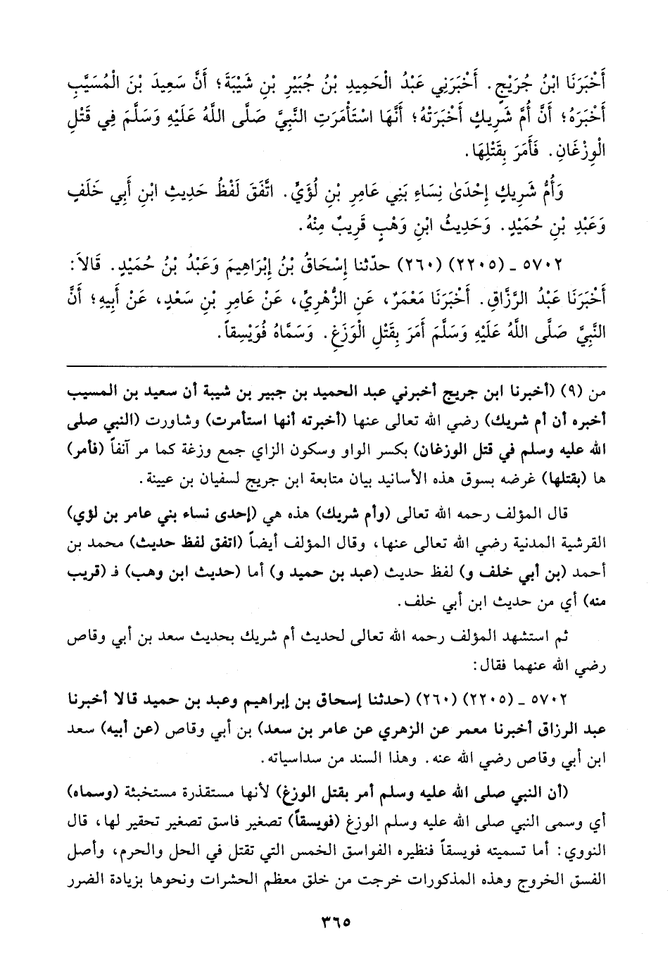 أَخْبَرَنَا ابْنُ جُرَيجٍ. أَخْبَرَنِي عَبْدُ الْحَمِيدِ بْنُ جُبَيرِ بْنِ شَيبَةَ؛ أَنَّ سَعِيدَ بْنَ الْمُسَيَّبِ أَخْبَرَهُ؛ أَنَّ أُمَّ شَرِيكٍ أَخْبَرَتْهُ؛ أَنَّهَا اسْتَأْمَرَتِ النَّبِي صَلى اللهُ عَلَيهِ وَسَلمَ في قَتْلِ الْوزْغَانِ. فَأَمَرَ بِقَتْلِهَا.