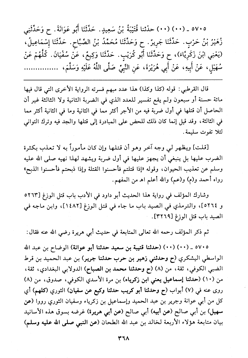 ٥٧٠٥ - (٠٠) (٠٠) (حدثنا قتيبة بن سعيد حدثنا أبو عوانة) الوضاح بن عبد الله الواسطي اليشكري (ح وحدثني زهير بن حرب حدثنا جرير) بن عبد الحميد بن قرط الضبي الكوفي، ثقة، من (٨) (ح وحدثنا محمد بن الصباح) الدولابي البغدادي، ثقة، من (١٠) (حدثنا إسماعيل يعني ابن زكرياء) بن مرة الأسدي الكوفي، صدوق، من (٨) روى عنه في (٧) أبواب (ح وحدثنا أبو كريب حدثنا وكيع عن سفيان) الثوري (كلهم) أي كل من أبي عوانة وجرير بن عبد الحميد وإسماعيل بن زكرياء وسفيان الثوري رووا (عن سهيل) بن أبي صالح (عن أبيه) أبي صالح (عن أبي هريرة) غرضه بسوق هذه الأسانيد بيان متابعة هؤلاء الأربعة لخالد بن عبد الله الطحان (عن النبي صلى الله عليه وسلم)