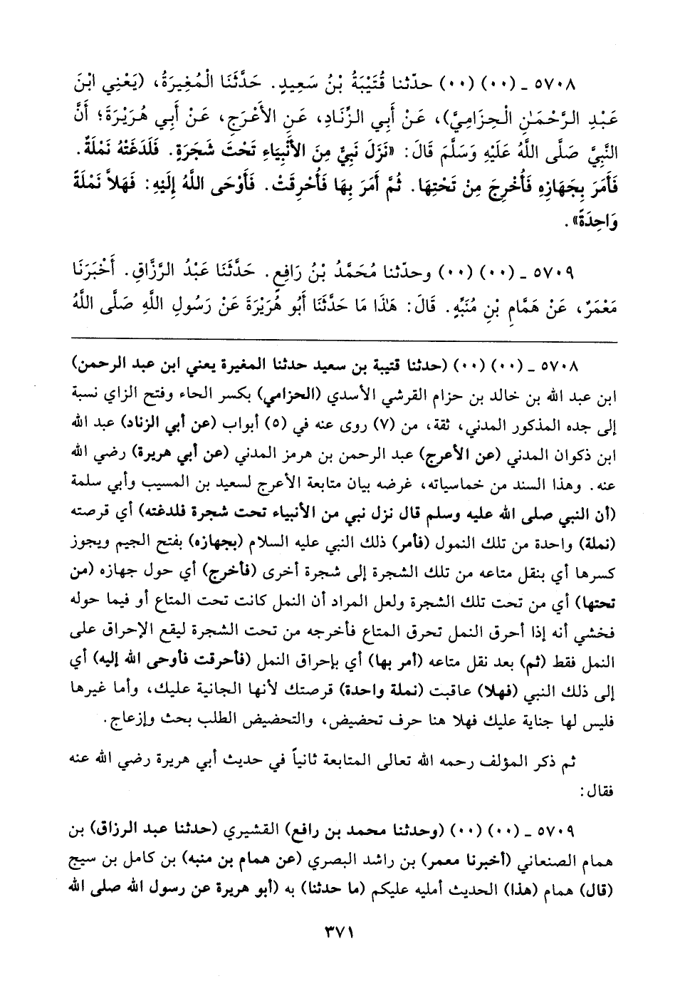 ٥٧٠٨ - (٠٠) (٠٠) حَدَّثَنَا قُتَيبَةُ بْنُ سَعِيدٍ. حَدَّثَنَا الْمُغِيرَةُ، (يَعْنِي ابْنَ عَبْدِ الرَّحْمَنِ الْحِزَامِيَّ) , عَنْ أَبِي الزِّنَادِ، عَنِ الأَعْرَجِ، عَنْ أَبِي هُرَيرَةَ؛ أَنَّ النَّبِيَّ صلى الله عليه وسلم قَال: "نَزَلَ نَبِيٌّ مِنَ الأَنْبِيَاءِ تَحْتَ شَجَرَةٍ. فَلَدَغَتْهُ نَمْلَةٌ. فَأَمَرَ بِجِهَازِهِ فَأُخْرِجَ مِنْ تَحْتِهَا. ثُمَّ أَمَرَ بِهَا فَأُحْرِقَتْ. فَأَوْحَى اللَّهُ إِلَيهِ: فَهَلَّا نَمْلَةً وَاحِدَةً".