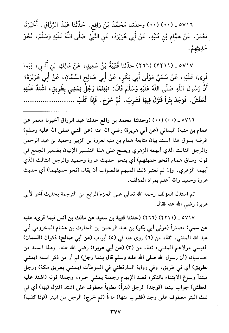 ٥٧١٦ - (٠٠) (٠٠) (وحدثنا محمد بن رافع حدثنا عبد الرزاق أخبرنا معمر عن همام بن منبه) اليماني (عن أبي هريرة) رضي الله عنه (عن النبي صلى الله عليه وسلم) غرضه بسوق هذا السند بيان متابعة همام بن منبه لعروة بن الزبير وحميد بن عبد الرحمن والرجل الثالث الذي أبهمه الزهري ويصح على هذا التفسير الإتيان بضمير الجمع في قوله وساق همام (نحو حديثهم) أي بنحو حديث عروة وحميد والرجل الثالث الذي أبهمه الزهري، وإن لم نعتبر ذلك المبهم فالصواب أن يقال (نحو حديثهما) أي حديث عروة وحميد والله أعلم بمراد المؤلف.