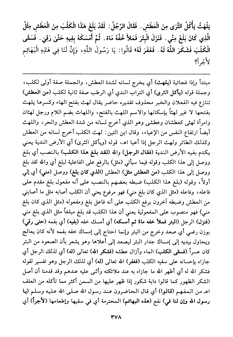 يَلْهَثُ يَأْكُلُ الثَّرَى مِنَ الْعَطَشِ. فَقَال الرَّجُلُ: لَقَدْ بَلَغَ هَذَا الْكَلْبَ مِنَ الْعَطَشِ مِثْلُ الَّذِي كَانَ بَلَغَ مِنِّي. فَنَزَلَ الْبِئْرَ فَمَلأَ خُفَّهُ مَاءً. ثُمَّ أَمْسَكَهُ بِفِيهِ حَتَّى رَقِيَ. فَسَقَى الْكَلْبَ فَشَكَرَ اللَّهُ لَهُ. فَغَفَرَ لَهُ" قَالُوا: يَا رَسُولَ اللهِ, وَإِنَّ لَنَا فِي هَذِهِ الْبَهَائِمِ لأَجْرًا؟