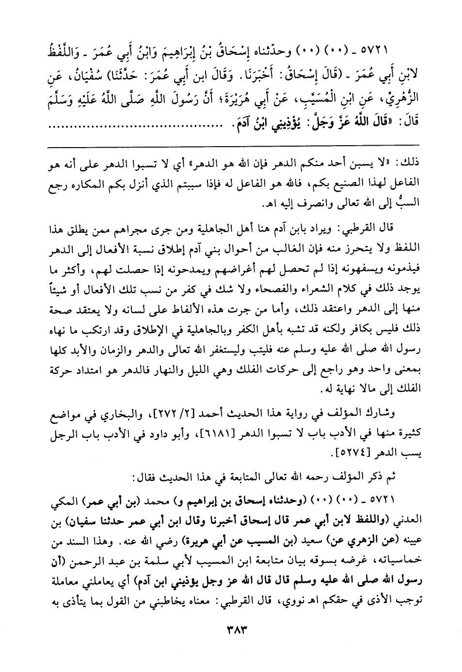 قال القرطبي: ويراد بابن آدم هنا أهل الجاهلية ومن جرى مجراهم ممن يطلق هذا اللفظ ولا يتحرز منه فإن الغالب من أحوال بني آدم إطلاق نسبة الأفعال إلى الدهر فيذمونه ويسفهونه إذا لم تحصل لهم أغراضهم ويمدحونه إذا حصلت لهم، وأكثر ما يوجد ذلك في كلام الشعراء والفصحاء ولا شك في كفر من نسب تلك الأفعال أو شيئًا منها إلى الدهر واعتقد ذلك، وأما من جرت هذه الألفاط على لسانه ولا يعتقد صحة ذلك فليس بكافر ولكنه قد تشبه بأهل الكفر وبالجاهلية في الإطلاق وقد ارتكب ما نهاه رسول الله صلى الله عليه وسلم عنه فليتب وليستغفر الله تعالى والدهر والزمان والأبد كلها بمعنى واحد وهو راجع إلى حركات الفلك وهي الليل والنهار فالدهر هو امتداد حركة الفلك إلى ما لا نهاية له.
