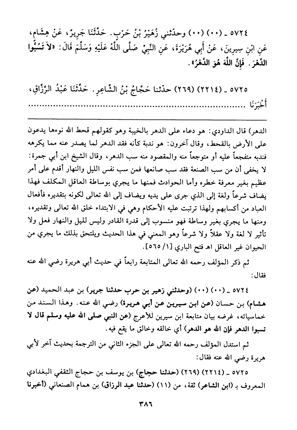 ٥٧٢٤ - (٠٠) (٠٠) (وحدثني زهير بن حرب حدثنا جرير) بن عبد الحميد (عن هشام) بن حسان (عن ابن سيرين عن أبي هريرة) رضي الله عنه. وهذا السند من خماسياته، غرضه بيان متابعة ابن سيرين للأعرج (عن النبي صلى الله عليه وسلم قال لا تسبوا الدهر فإن الله هو الدهر) أي خالقه وخالق ما يقع فيه.