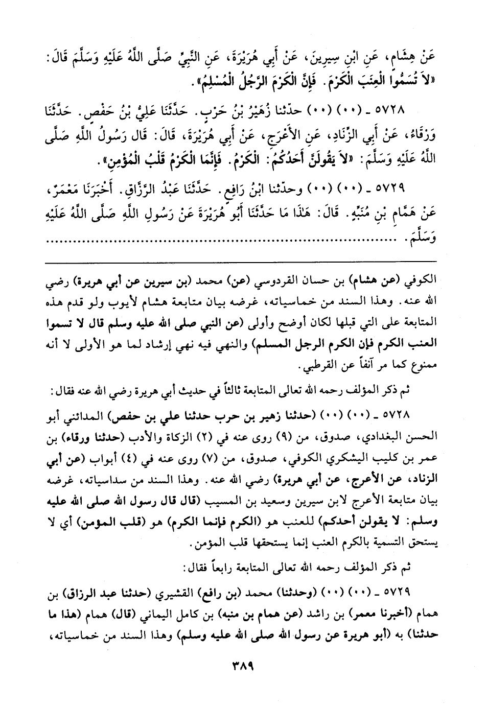 ٥٧٢٨ - (٠٠) (٠٠) (حدثنا زهير بن حرب حدثنا علي بن حفص) المدائني أبو الحسن البغدادي، صدوق، من (٩) روى عنه في (٢) الزكاة والأدب (حدثنا ورقاء) بن عمر بن كليب اليشكري الكوفي، صدوق، من (٧) روى عنه في (٤) أبواب (عن أبي الزناد، عن الأعرج، عن أبو هريرة) رضي الله عنه. وهذا السند من سداسياته، غرضه بيان متابعة الأعرج لابن سيرين وسعيد بن المسيب (قال قال رسول الله صلى الله عليه وسلم: لا يقولن أحدكم) للعنب هو (الكرم فإنما الكرم) هو (قلب المؤمن) أي لا يستحق التسمية بالكرم العنب إنما يستحقها قلب المؤمن.