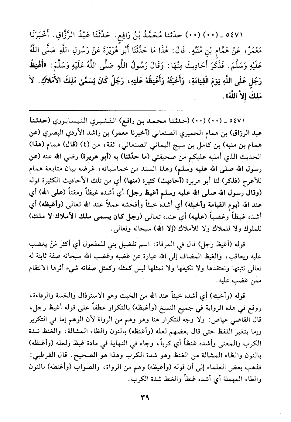 ٥٤٧١ - (٠٠) (٠٠) (حدثنا محمد بن رافع) القشيري النيسابوري (حدثنا عبد الرزاق) بن همام الحميري الصنعاني (أخبرنا معمر) بن راشد الأزدي البصري (عن همام بن منبه) بن كامل بن سيج اليماني الصنعاني، ثقة، من (٤) (قال) همام (هذا) الحديث الذي أمليه عليكم من صحيفتي (ما حدَّثنا) به (أبو هريرة) رضي الله عنه (عن رسول الله صلى الله عليه وسلم) وهذا السند من خماسياته، غرضه بيان متابعة همام للأعرج (فذكر) لنا أبو هريرة (أحاديث) كثيرة (منها) أي من تلك الأحاديث الكثيرة قوله (وقال رسول الله صلى الله عليه وسلم أغيظ رجل) أي أشده غيظًا ومقتًا (على الله) أي عند الله (يوم القيامة وأخبثه) أي أشده خبثًا وأفحشه عملأ عند الله تعالى (وأغيظه) أي أشده غيظًا وغضبًا (عليه) أي عنده تعالى (رجل كان يسمى ملك الأملاك لا ملك) للملوك ولا للملاك ولا للأملاك (إلا الله) سبحانه وتعالى.