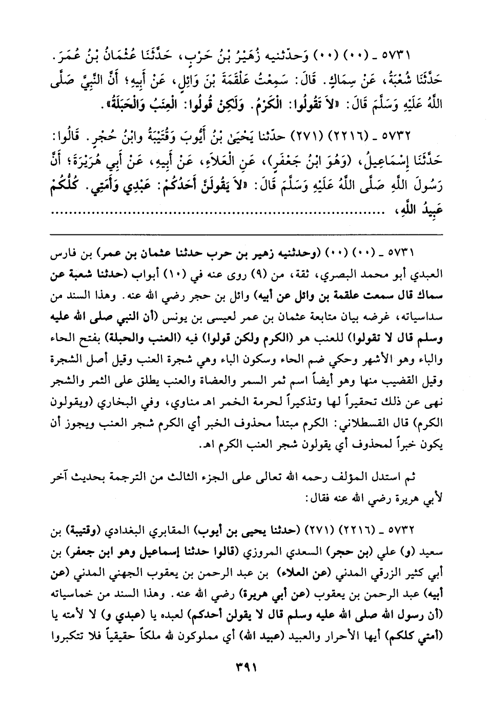 ٥٧٣١ - (٠٠) (٠٠) وَحَدَّثَنِيهِ زُهَيرُ بْنُ حَرْبٍ، حَدَّثَنَا عُثْمَانُ بْنُ عُمَرَ. حَدَّثَنَا شُعْبَةُ، عَنْ سِمَاكٍ. قَال: سَمِعْتُ عَلْقَمَةَ بْنَ وَائِلٍ، عَنْ أَبِيهِ؛ أَنَّ النَّبِيَّ صلى الله عليه وسلم قَال: "لَا تَقُولُوا: الْكَرْمُ. وَلَكِنْ قُولُوا: الْعِنَبُ وَالْحَبَلَةُ".
