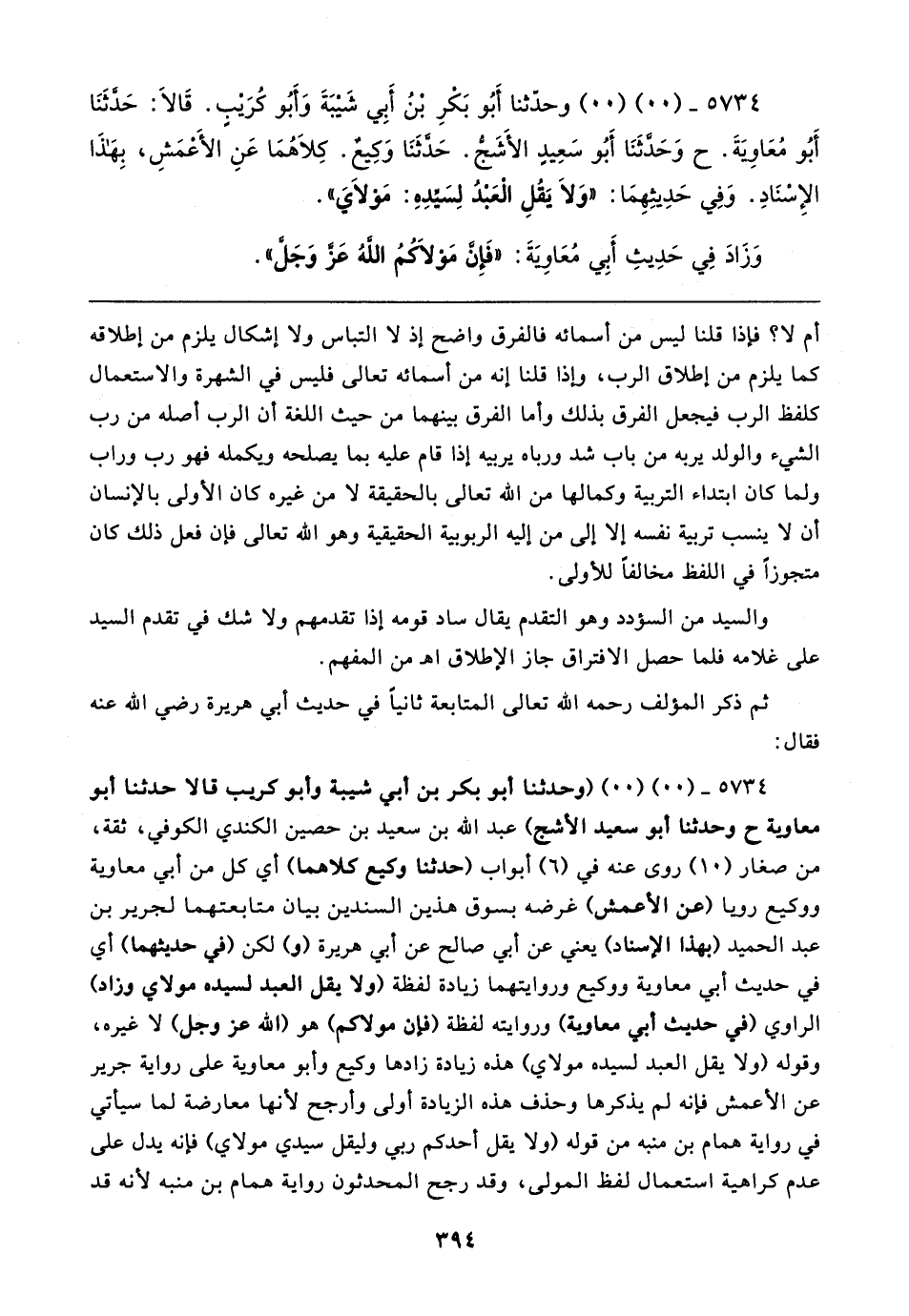 ٥٧٣٤ - (٠٠) (٠٠) (وحدثنا أبو بكر بن أبي شيبة وأبو كريب قالا حدثنا أبو معاوية ح وحدثنا أبو سعيد الأشج) عبد الله بن سعيد بن حصين الكندي الكوفي، ثقة، من صغار (١٠) روى عنه في (٦) أبواب (حدثنا وكيع كلاهما) أي كل من أبي معاوية ووكيع رويا (عن الأعمش) غرضه بسوق هذين السندين بيان متابعتهما لجرير بن عبد الحميد (بهذا الإسناد) يعني عن أبي صالح عن أبي هريرة (و) لكن (في حديثهما) أي في حديث أبي معاوية ووكيع وروايتهما زيادة لفظة (ولا يقل العبد لسيده مولاي وزاد) الراوي (في حديث أبي معاوية) وروايته لفظة (فإن مولاكم) هو (الله عزَّ وجلَّ) لا غيره، وقوله (ولا يقل العبد لسيده مولاي) هذه زيادة زادها وكيع وأبو معاوية على رواية جرير عن الأعمش فإنه لم يذكرها وحذف هذه الزيادة أولى وأرجح لأنها معارضة لما سيأتي في رواية همام بن منبه من قوله (ولا يقل أحدكم ربي وليقل سيدي مولاي) فإنه يدل على عدم كراهية استعمال لفظ المولى، وقد رجح المحدثون رواية همام بن منبه لأنه قد