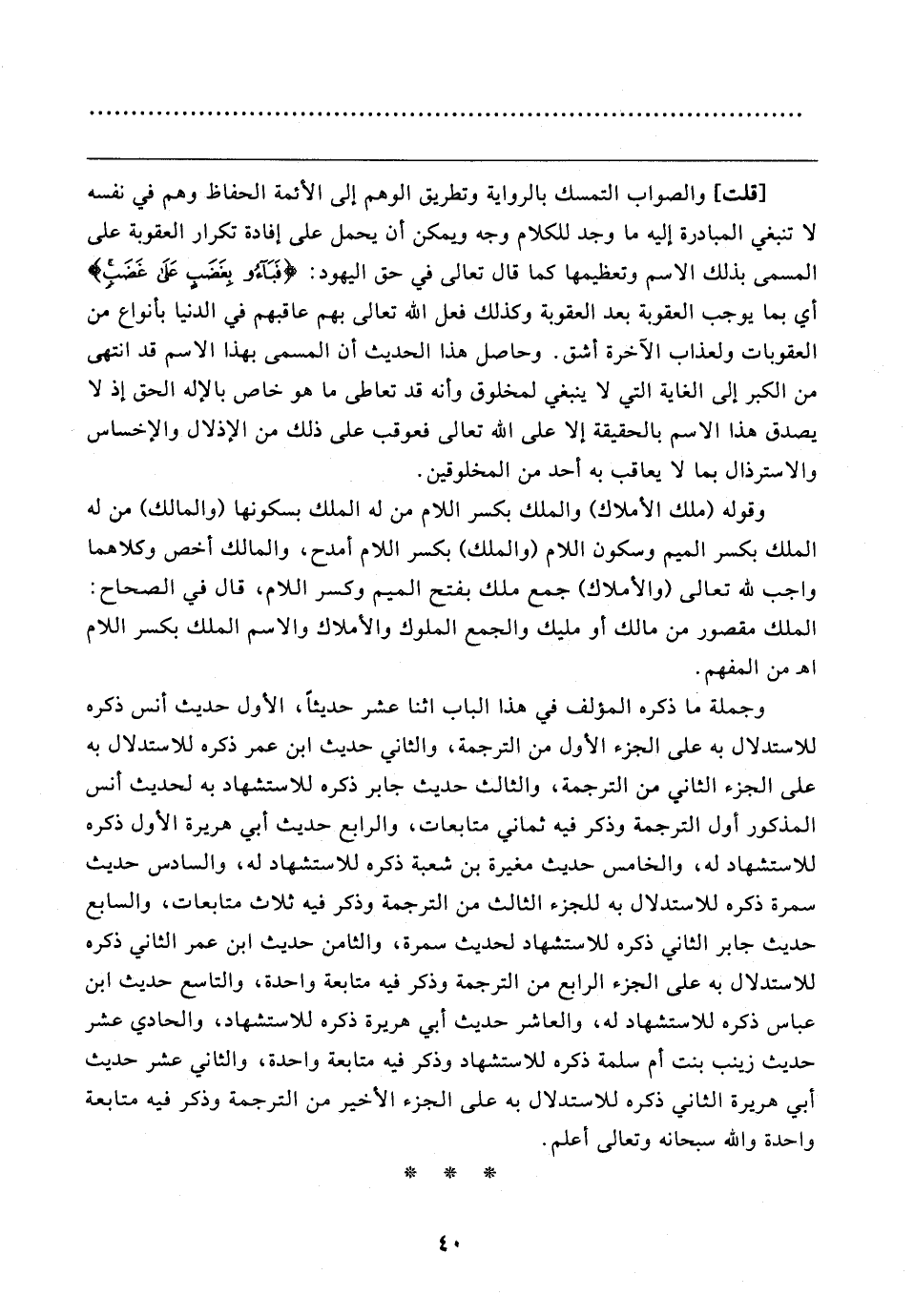 وقوله (ملك الأملاك) والملك بكسر اللام من له الملك بسكونها (والمالك) من له الملك بكسر الميم وسكون اللام (والملك) بكسر اللام أمدح، والمالك أخص وكلاهما واجب لله تعالى (والأملاك) جمع ملك بفتح الميم وكسر اللام، قال في الصحاح: الملك مقصور من مالك أو عليك والجمع الملوك والأملاك والاسم الملك بكسر اللام اهـ من المفهم.