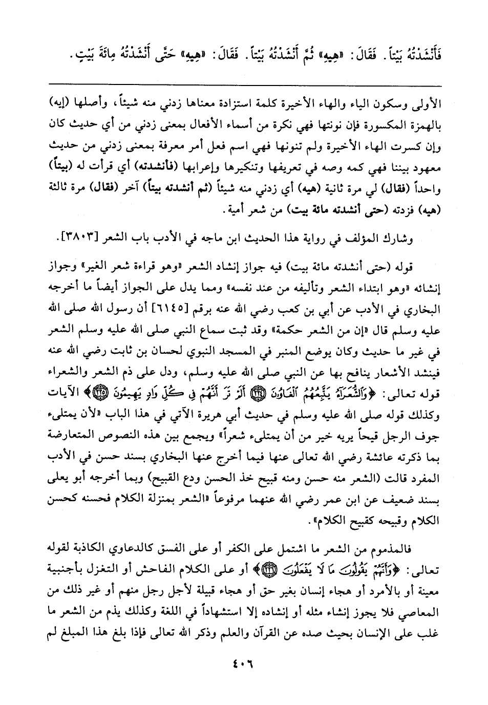 قوله (حتى أنشدته مائة بيت) فيه جواز إنشاد الشعر "وهو قراءة شعر الغير" وجواز إنشائه "وهو ابتداء الشعر وتأليفه من عند نفسه" ومما يدل على الجواز أيضًا ما أخرجه البخاري في الأدب عن أبي بن كعب رضي الله عنه برقم [٦١٤٥] أن رسول الله صلى الله عليه وسلم قال "إن من الشعر حكمة" وقد ثبت سماع النبي صلى الله عليه وسلم الشعر في غير ما حديث وكان يوضع المنبر في المسجد النبوي لحسان بن ثابت رضي الله عنه فينشد الأشعار ينافح بها عن النبي صلى الله عليه وسلم، ودل على ذم الشعر والشعراء قوله تعالى: {وَالشُّعَرَاءُ يَتَّبِعُهُمُ الْغَاوُونَ (٢٢٤) أَلَمْ تَرَ أَنَّهُمْ فِي كُلِّ وَادٍ يَهِيمُونَ (٢٢٥)} الآيات وكذلك قوله صلى الله عليه وسلم في حديث أبي هريرة الآتي في هذا الباب "لأن يمتلئ جوف الرجل قيحًا يريه خير من أن يمتلئ شعرًا" ويجمع بين هذه النصوص المتعارضة بما ذكرته عائشة رضي الله تعالى عنها فيما أخرج عنها البخاري بسند حسن في الأدب المفرد قالت (الشعر منه حسن ومنه قبيح خذ الحسن ودع القبيح) وبما أخرجه أبو يعلى بسند ضعيف عن ابن عمر رضي الله عنهما مرفوعا "الشعر بمنزلة الكلام فحسنه كحسن الكلام وقبيحه كقبيح الكلام".