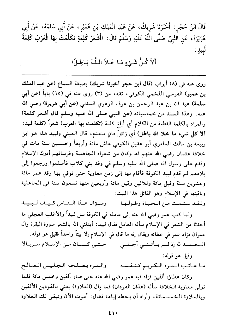 قَال ابْنُ حُجْرٍ: أَخْبَرَنَا شَرِيكٌ، عَنْ عَبْدِ الْمَلِكِ بْنِ عُمَيرٍ، عَنْ أَبِي سَلَمَةَ، عَنْ أَبِي هُرَيرَةَ، عَنِ النَّبِيِّ صلى الله عليه وسلم قَال: "أَشْعَرُ كَلِمَةٍ تَكَلَّمَتْ بِهَا الْعَرَبُ كَلِمَةُ لَبِيدٍ: