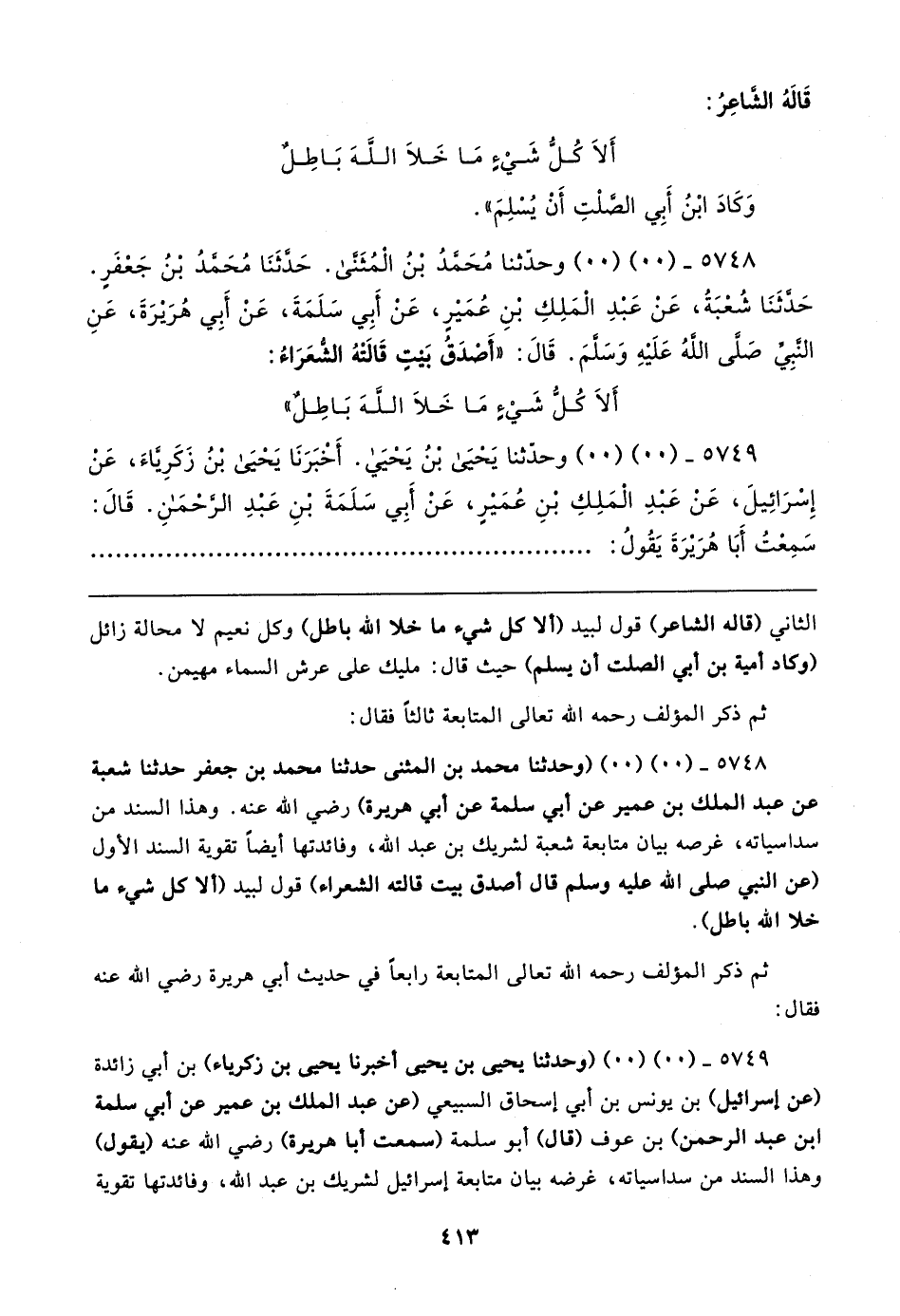 ٥٧٤٨ - (٠٠) (٠٠) (وحدثنا محمد بن المثنى حدثنا محمد بن جعفر حدثنا شعبة عن عبد الملك بن عمير عن أبي سلمة عن أبي هريرة) رضي الله عنه. وهذا السند من سداسياته، غرصه بيان متابعة شعبة لشريك بن عبد الله، وفائدتها أيضًا تقوية السند الأول (عن النبي صلى الله عليه وسلم قال أصدق بيت قالته الشعراء) قول لبيد (ألا كل شيء ما خلا الله باطل).