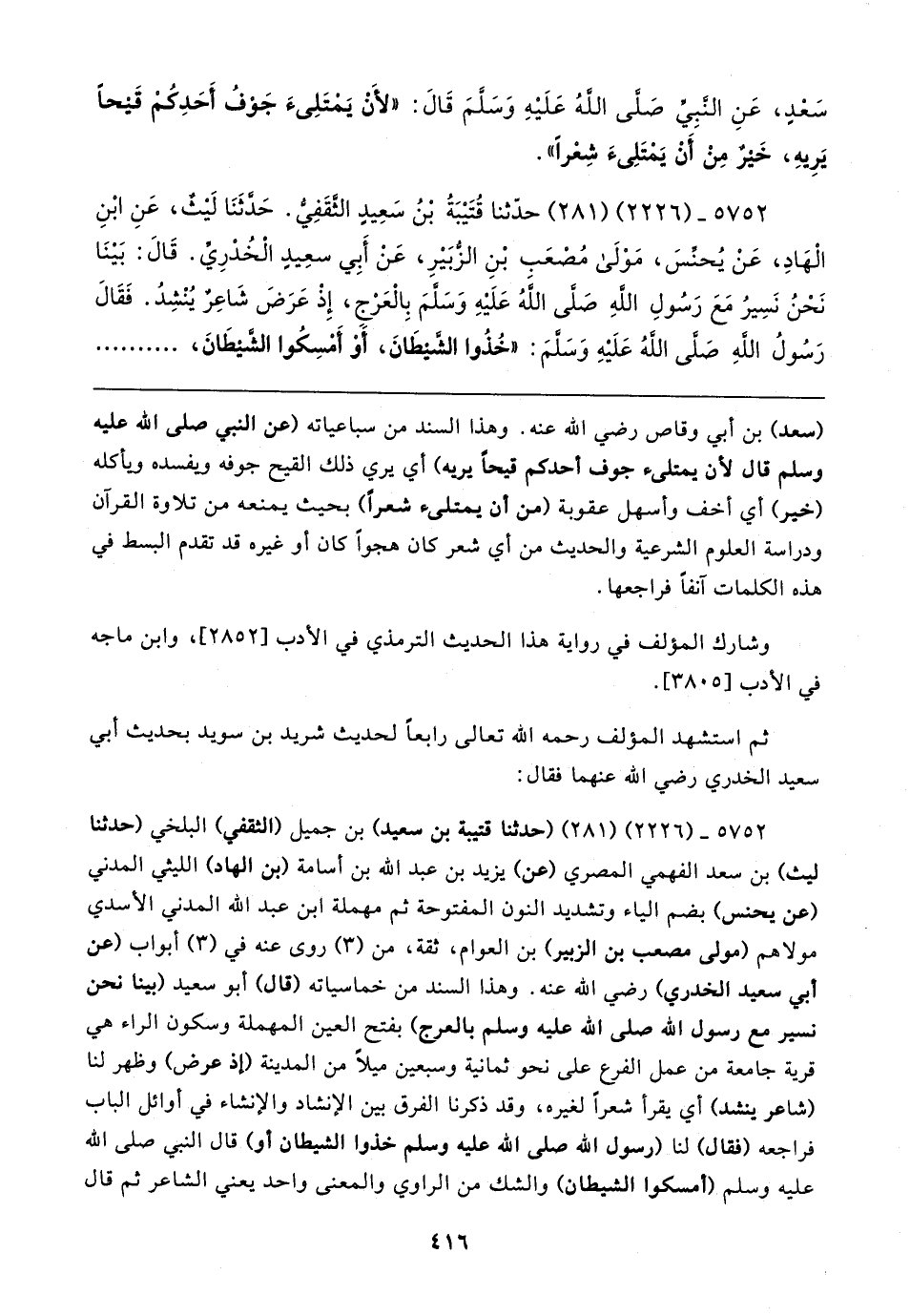 ٥٧٥٢ - (٢٢٢٦) (٢٨١) حَدَّثَنَا قُتَيبَةُ بْنُ سَعِيدٍ الثَّقَفِيُّ. حَدَّثَنَا لَيثٌ، عَنِ ابْنِ الْهَادِ، عَنْ يُحَنِّسَ، مَوْلَى مُصْعَبِ بْنِ الزُّبَيرِ, عَنْ أَبِي سَعِيدٍ الْخُدْرِيِّ. قَال: بَينَا نَحْنُ نَسِيرُ مَعَ رَسُولِ اللَّهِ صلى الله عليه وسلم بِالْعَرْجِ, إِذْ عَرَضَ شَاعِرٌ يُنْشِدُ. فَقَال رَسُولُ اللهِ صلى الله عليه وسلم: "خُذُوا الشَّيطَانَ, أَوْ أَمْسِكُوا الشَّيطَانَ,