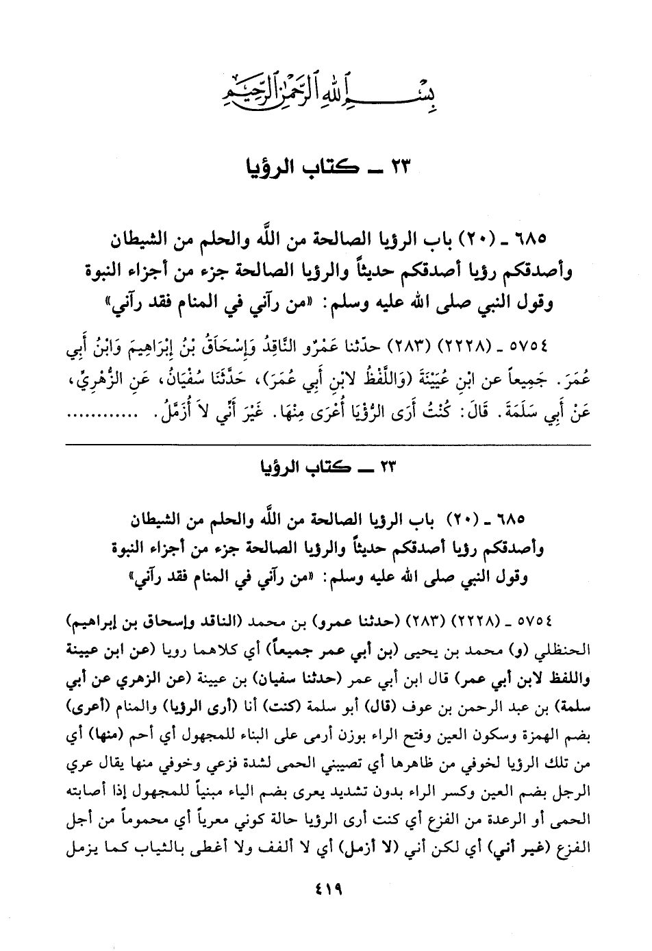 ٥٧٥٤ - (٢٢٢٨) (٢٨٣) حَدَّثَنَا عَمْرٌو النَّاقِدُ وَإِسْحَاقُ بْنُ إِبْرَاهِيمَ وَابْنُ أَبِي عُمَرَ. جَمِيعًا عَنِ ابْنِ عُيَينَةَ (وَاللَّفْظُ لا بْنِ أَبِي عُمَرَ) , حَدَّثَنَا سُفْيَانُ، عَنِ الزُّهْرِيِّ، عَنْ أَبِي سَلَمَةَ، قَال: كُنْتُ أَرَى الرُّؤْيَا أُعْرَى مِنْهَا. غَيرَ أَنِّي لَا أُزَمَّلُ
