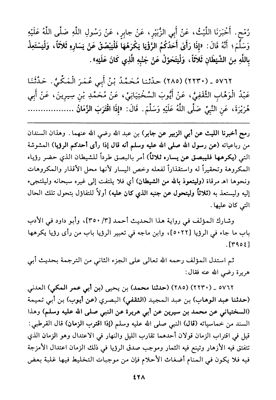 ٥٧٦٢ - (٢٢٣٠) (٢٨٥) (حدثنا محمد) بن يحيى (بن أبي عمر المكي) العدني (حدثنا عبد الوهاب) بن عبد المجيد (الثقفي) البصري (عن أيوب) بن أبي تميمة (السختياني عن محمد بن سيرين عن أبي هريرة عن النبي صلى الله عليه وسلم) وهذا السند من خماسياته (قال) النبي صلى الله عليه وسلم (إذا اقترب الزمان) قال القرطبي: قيل في اقتراب الزمان قولان أحدهما تقارب الليل والنهار في الاعتدال وهو الزمان الذي تتفتق فيه الأزهار وتينع فيه الثمار وموجب صدق الرؤيا في ذلك الزمان اعتدال الأمزجة فيه فلا يكون في المنام أضغاث الأحلام فإن من موجبات التخليط فيها غلبة بعض