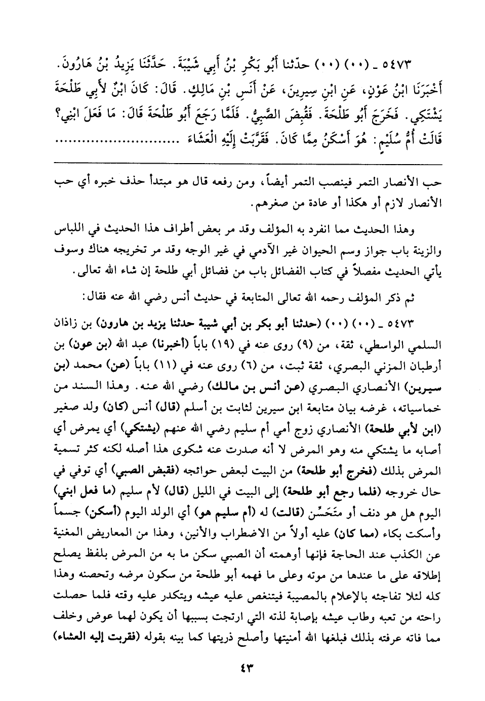 ٥٤٧٣ - (٠٠) (٠٠) (حدثنا أبو بكر بن أبي شيبة حدثنا يزيد بن هارون) بن زاذان السلمي الواسطي، ثقة، من (٩) روى عنه في (١٩) بابا (أخبرنا) عبد الله (بن عون) بن أرطبان المزني البصري، ثقة ثبت، من (٦) روى عنه في (١١) بابا (عن) محمد (بن سيرين) الأنصاري البصري (عن أنس بن مالك) رضي الله عنه. وهذا السند من خماسياته، غرضه بيان متابعة ابن سيرين لثابت بن أسلم (قال) أنس (كان) ولد صغير (ابن لأبي طلحة) الأنصاري زوج أمي أم سليم رضي الله عنهم (يشتكي) أي يمرض أي أصابه ما يشتكي منه وهو المرض لا أنه صدرت عنه شكوى هذا أصله لكنه أكثر تسمية المرض بذلك (فخرج أبو طلحة) من البيت لبعض حوائجه (فقبض الصبي) أي توفي في حال خروجه (فلما رجع أبو طلحة) إلى البيت في الليل (قال) لأم سليم (ما فعل ابني) اليوم هل هو دنف أو متَحسِّن (فالت) له (أم سلبم هو) أي الولد اليوم (أسكن) جسمًا وأسكت بكاء (مما كان) عليه أولًا من الاضطراب والأنين، وهذا من المعاريض المغنية عن الكذب عند الحاجة فإنها أوهمته أن الصبي سكن ما به من المرض بلفظ يصلح إطلاقه على ما عندها من موته وعلى ما فهمه أبو طلحة من سكون مرضه وتحصنه وهذا كله لئلا تفاجئه بالإعلام بالمصيبة فيتنغص عليه عيشه ويتكدر عليه وقته فلما حصلت راحته من تعبه وطاب عيشه بإصابة لذته التي ارتجت بسببها أن يكون لهما عوض وخلف مما فاته عرفته بذلك فبلغها الله أمنيتها وأصلح ذريتها كما بينه بقوله (فقربت إليه العشاء)