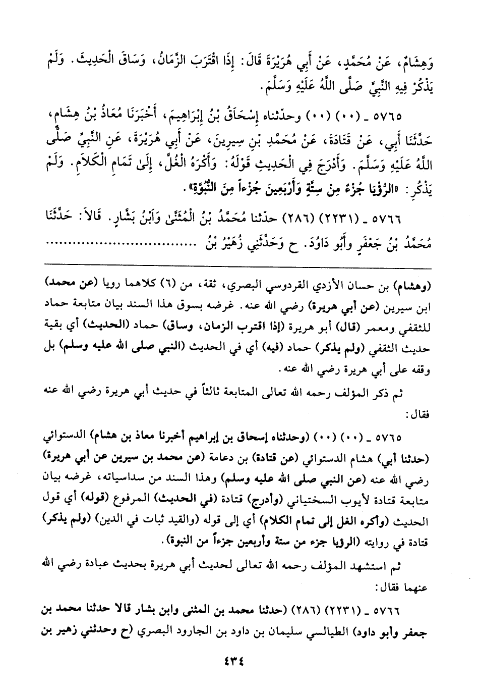 ٥٧٦٥ - (٠٠) (٠٠) (وحدثناه إسحاق بن إبراهيم أخبرنا معاذ بن هشام) الدستوائي (حدثنا أبي) هشام الدستوائي (عن قتادة) بن دعامة (عن محمد بن سيرين عن أبي هريرة) رضي الله عنه (عن النبي صلى الله عليه وسلم) وهذا السند من سداسياته، غرضه بيان متابعة قتادة لأيوب السختياني (وأدرج) قتادة (في الحديث) المرفوع (قوله) أي قول الحديث (وكره الغل إلى تمام الكلام) أي إلى قوله (والقيد ثبات في الدين) (ولم يذكر) قتادة في روايته (الرؤيا جزء من ستة وأربعين جزءًا من النبوة).