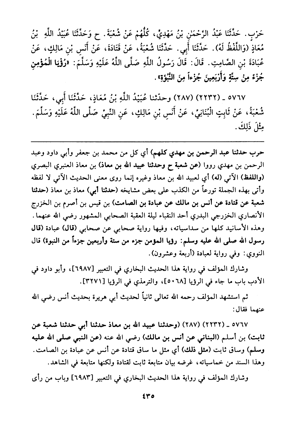 حَرْبٍ. حَدَّثَنَا عَبْدُ الرَّحْمَنِ بْنُ مَهْدِيٍّ، كُلُّهُمْ عَنْ شُعْبَةَ. ح وَحَدَّثَنَا عُبَيدُ اللَّهِ بْنُ مُعَاذٍ (وَاللَّفْظُ لَهُ). حَدَّثَنَا أَبِي. حَدَّثَنَا شُعْبَةُ، عَنْ قَتَادَةَ، عَنْ أَنَسِ بْنِ مَالِكٍ، عَنْ عُبَادَةَ بْنِ الصَّامِتِ. قَال: قَال رَسُولُ اللهِ صلى الله عليه وسلم: "رُؤْيَا الْمُؤْمِنِ جُزْءٌ مِنْ سِتَّةٍ وَأَرْبَعِينَ جُزْءًا مِنَ النُّبُوَّةِ".