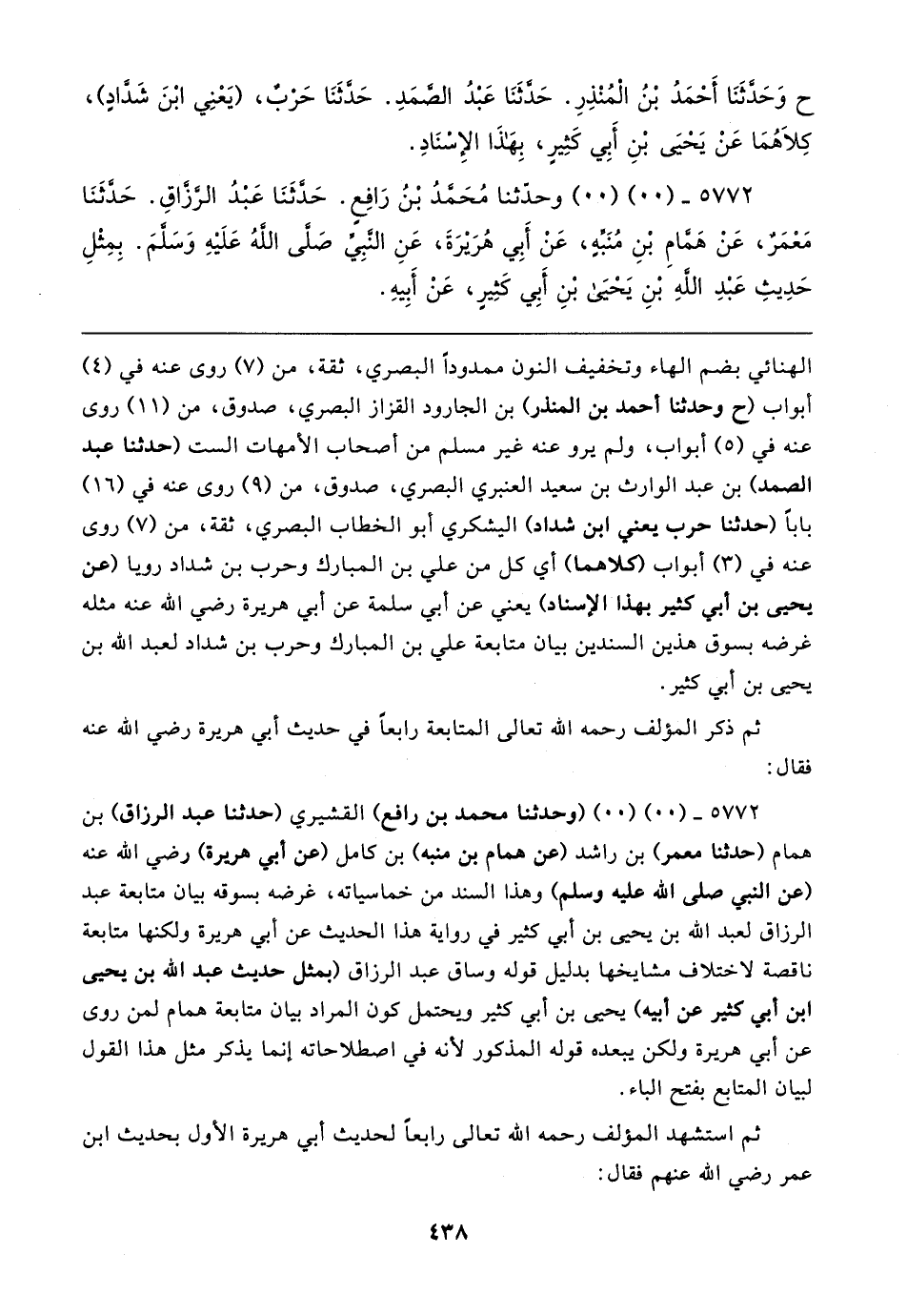 ٥٧٧٢ - (٠٠) (٠٠) (وحدثنا محمد بن رافع) القشيري (حدثنا عبد الرزاق) بن همام (حدثنا معمر) بن راشد (عن همام بن منبه) بن كامل (عن أبي هريرة) رضي الله عنه (عن النبي صلى الله عليه وسلم) وهذا السند من خماسياته، غرضه بسوقه بيان متابعة عبد الرزاق لعبد الله بن يحيى بن أبي كثير في رواية هذا الحديث عن أبي هريرة ولكنها متابعة ناقصة لاختلاف مشايخها بدليل قوله وساق عبد الرزاق (بمثل حديث عبد الله بن يحيى ابن أبي كثير عن أبيه) يحيى بن أبي كثير ويحتمل كون المراد بيان متابعة همام لمن روى عن أبي هريرة ولكن يبعده قوله المذكور لأنه في اصطلاحاته إنما يذكر مثل هذا القول لبيان المتابع بفتح الباء.