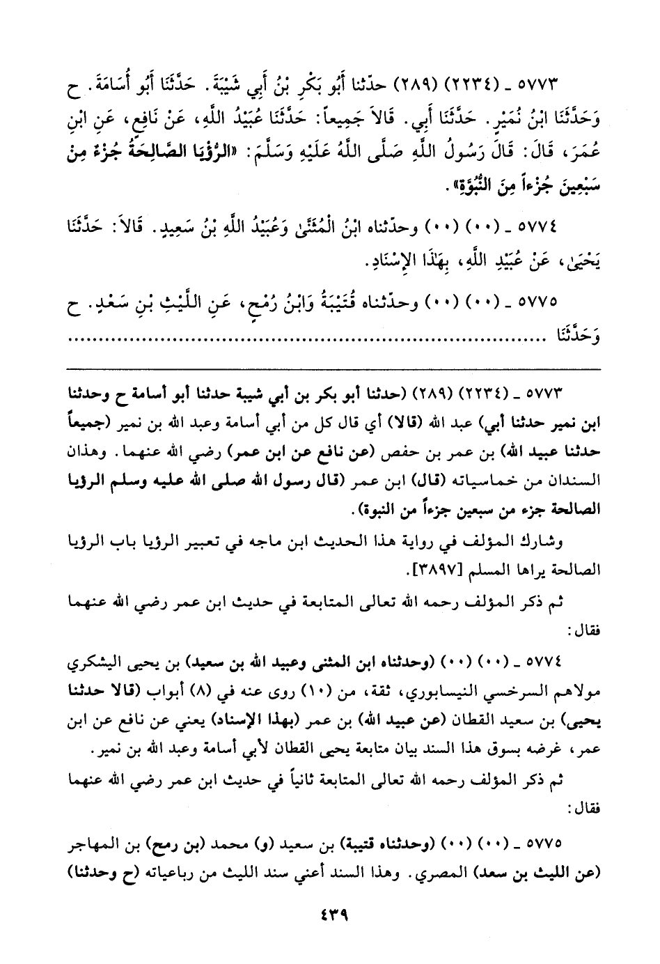 ٥٧٧٣ - (٢٢٣٤) (٢٨٩) (حدثنا أبو بكر بن أبي شيبة حدثنا أبو أسامة ح وحدثنا ابن نمير حدثنا أبي) عبد الله (قالا) أي قال كل من أبي أسامة وعبد الله بن نمير (جميعًا حدثنا عبيد الله) بن عمر بن حفص (عن نافع عن ابن عمر) رضي الله عنهما. وهذان السندان من خماسياته (قال) ابن عمر (قال رسول الله صلى الله عليه وسلم الرؤيا الصالحة جزء من سبعين جزءًا من النبوة).