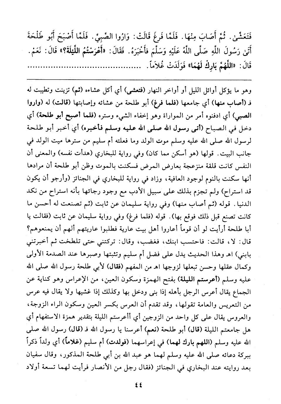 فَتَعَشَّى. ثُمَّ أصَابَ مِنْها. فَلَما فَرغَ قَالتْ: وَارُوا الصَّبِي. فَلَما أصبَحَ أَبُو طَلْحَةَ أَتَى رَسُولَ الله صَلى الله عَلَيهِ وَسَلمَ فأخْبَرَهُ. فَقَال: "أَعْرَسْتُمُ الليلَةَ؟ " قَال: نَعَم. قَال: "اللهم بَارِكْ لَهُمَا" فَوَلَدَتْ غُلامًا