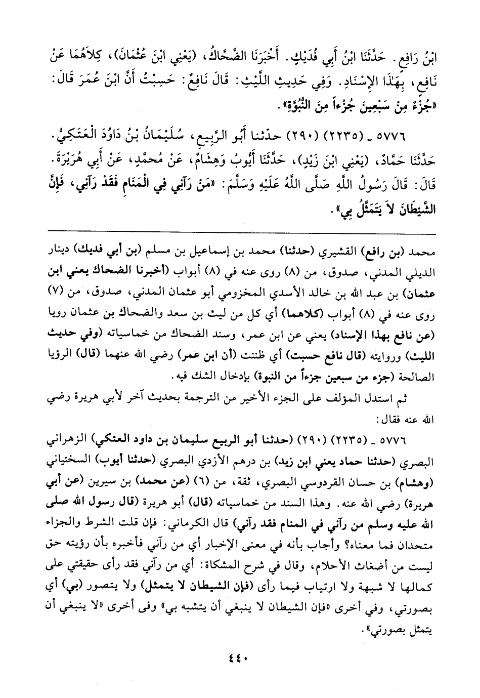 ابْنُ رَافِعٍ. حَدَّثَنَا ابْنُ، أَبِي فُدَيكٍ. أَخْبَرَنَا الضَّحَّاكُ، (يَعْنِي ابْنَ عُثْمَانَ) , كِلاهُمَا عَنْ نَافِعٍ، بِهَذَا الإِسْنَادِ. وَفِي حَدِيثِ اللَّيثِ: قَال نَافِعٌ: حَسِبْتُ أَنَّ ابْنَ عُمَرَ قَال: "جُزْءٌ مِنْ سَبْعِينَ جُزْءًا مِنَ النُّبُوَّةِ".