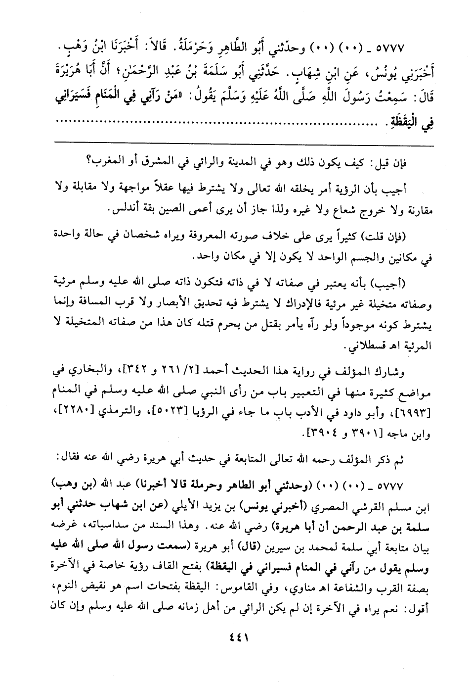 (أجيب) بأنه يعتبر في صفاته لا في ذاته فتكون ذاته صلى الله عليه وسلم مرئية وصفاته متخيلة غير مرئية فالإدراك لا يشترط فيه تحديق الأبصار ولا قرب المسافة وإنما يشترط كونه موجودًا ولو رآه يأمر بقتل من يحرم قتله كان هذا من صفاته المتخيلة لا المرئية اهـ قسطلاني.