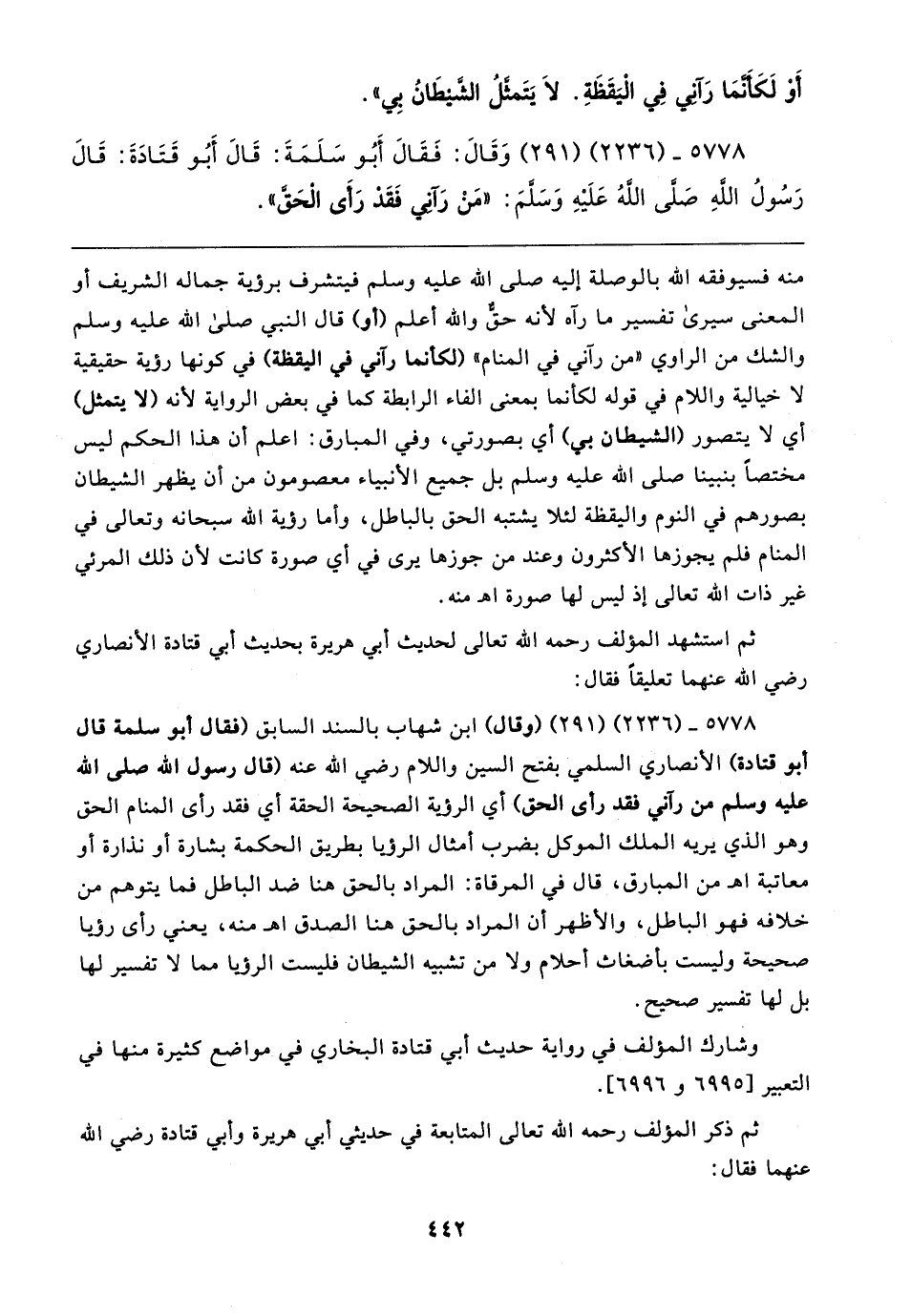 ٥٧٧٨ - (٢٢٣٦) (٢٩١) وَقَال: فَقَال أَبُو سَلَمَةَ: قَال أَبُو قَتَادَةَ: قَال رَسُولُ اللهِ صلى الله عليه وسلم: "مَنْ رَآنِي فَقَدْ رَأَى الْحَقَّ"