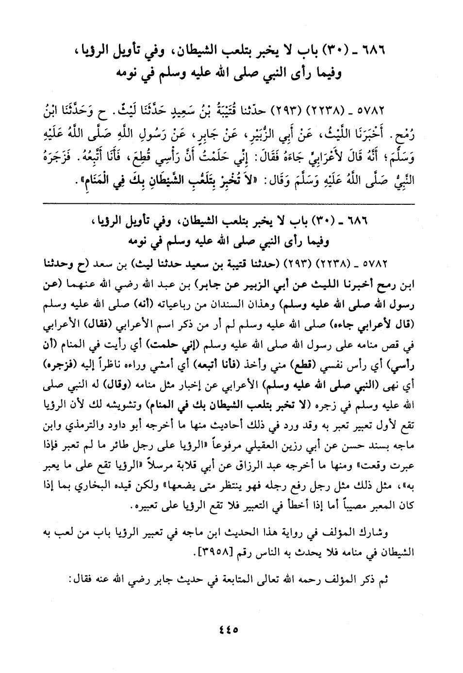 ٦٨٦ - (٣٠) باب لا يخبر بتلعب الشيطان، وفي تأويل الرؤيا، وفيما رأى النبي صلى الله عليه وسلم في نومه
