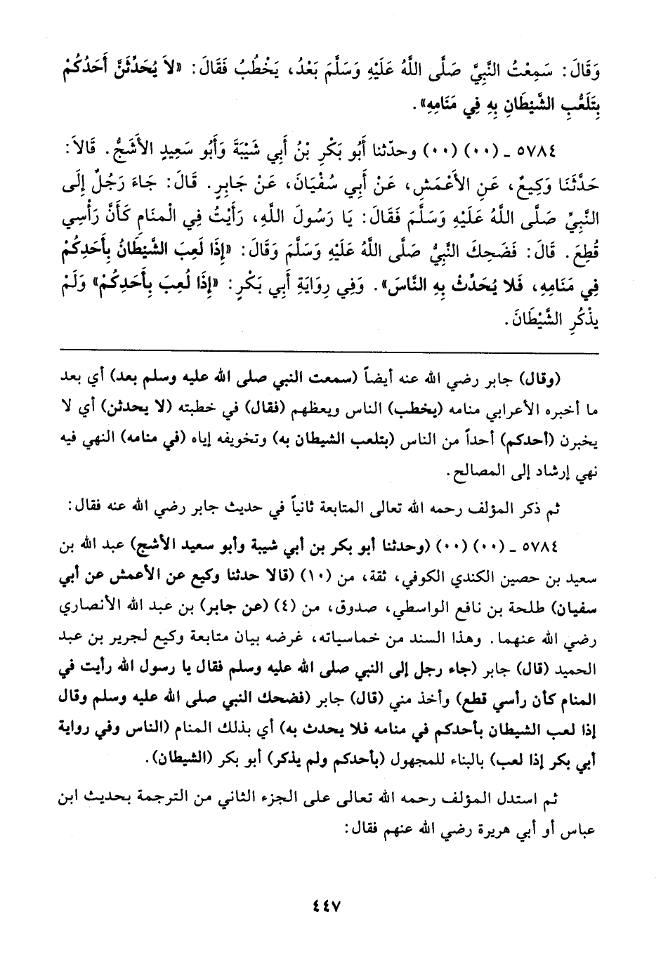 ٥٧٨٤ - (٠٠) (٠٠) وَحَدَّثَنَا أَبُو بَكْرِ بْنُ أَبِي شَيبَةَ وَأَبُو سَعِيدٍ الأَشَجُّ. قَالا: حَدَّثَنَا وَكِيعٌ، عَنِ الأَعْمَشِ، عَنْ أَبِي سُفْيَانَ، عَنْ جَابِرٍ. قَال: جَاءَ رَجُلٌ إِلَى النَّبِيِّ صلى الله عليه وسلم فَقَال: يَا رَسُولَ اللهِ, رَأَيتُ فِي الْمَنَامِ كَأَنَّ رَأْسِي قُطِعَ. قَال: فَضَحِكَ النَّبِيُّ صلى الله عليه وسلم وَقَال: "إِذَا لَعِبَ الشَّيطَانُ بِأَحَدِكُمْ فِي مَنَامِهِ, فَلَا يُحَدِّثْ بِهِ النَّاسَ". وَفِي رِوَايَةِ أَبِي بَكْرٍ: "إِذَا لُعِبَ بِأَحَدِكُمْ" وَلَمْ يَذْكُرِ الشَّيطَانَ