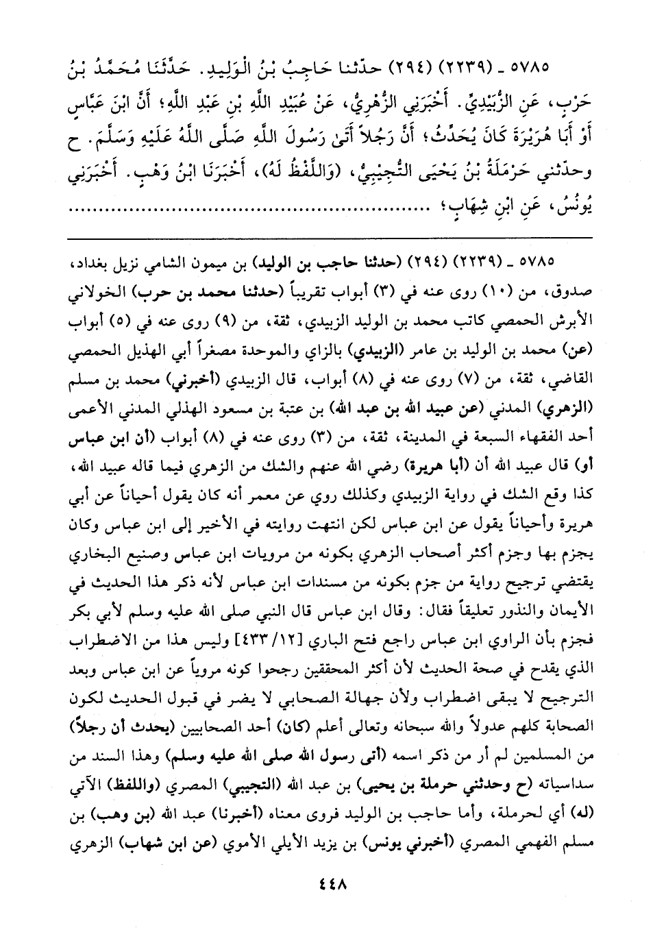 ٥٧٨٥ - (٢٢٣٩) (٢٩٤) (حدثنا حاجب بن الوليد) بن ميمون الشامي نزيل بغداد، صدوق، من (١٠) روى عنه في (٣) أبواب تقريبًا (حدثنا محمد بن حرب) الخولاني الأبرش الحمصي كاتب محمد بن الوليد الزبيدي، ثقة، من (٩) روى عنه في (٥) أبواب (عن) محمد بن الوليد بن عامر (الزبيدي) بالزاي والموحدة مصغرًا أبي الهذيل الحمصي القاضي، ثقة، من (٧) روى عنه في (٨) أبواب، قال الزبيدي (أخبرني) محمد بن مسلم (الزهري) المدني (عن عبيد الله بن عبد الله) بن عتبة بن مسعود الهذلي المدني الأعمى أحد الفقهاء السبعة في المدينة، ثقة، من (٣) روى عنه في (٨) أبواب (أن ابن عباس أو) قال عبيد الله أن (أبا هريرة) رضي الله عنهم والشك من الزهري فيما قاله عبيد الله، كذا وقع الشك في رواية الزبيدي وكذلك روي عن معمر أنه كان يقول أحيانًا عن أبي هريرة وأحيانًا يقول عن ابن عباس لكن انتهت روايته في الأخير إلى ابن عباس وكان يجزم بها وجزم أكثر أصحاب الزهري بكونه من مرويات ابن عباس وصنيع البخاري يقتضي ترجيح رواية من جزم بكونه من مسندات ابن عباس لأنه ذكر هذا الحديث في الأيمان والنذور تعليقًا فقال: وقال ابن عباس قال النبي صلى الله عليه وسلم لأبي بكر فجزم بأن الراوي ابن عباس راجع فتح الباري [١٢/ ٤٣٣] وليس هذا من الاضطراب الذي يقدح في صحة الحديث لأن أكثر المحققين رجحوا كونه مرويًّا عن ابن عباس وبعد الترجيح لا يبقى اضطراب ولأن جهالة الصحابي لا يضر في قبول الحديث لكون الصحابة كلهم عدولًا والله سبحانه وتعالى أعلم (كان) أحد الصحابيين (يحدث أن رجلًا) من المسلمين لم أر من ذكر اسمه (أتى رسول الله صلى الله عليه وسلم) وهذا السند من سداسياته (ح وحدثني حرملة بن يحيى) بن عبد الله (التجيبي) المصري (واللفظ) الآتي (له) أي لحرملة، وأما حاجب بن الوليد فروى معناه (أخبرنا) عبد الله (بن وهب) بن مسلم الفهمي المصري (أخبرني يونس) بن يزيد الأيلي الأموي (عن ابن شهاب) الزهري