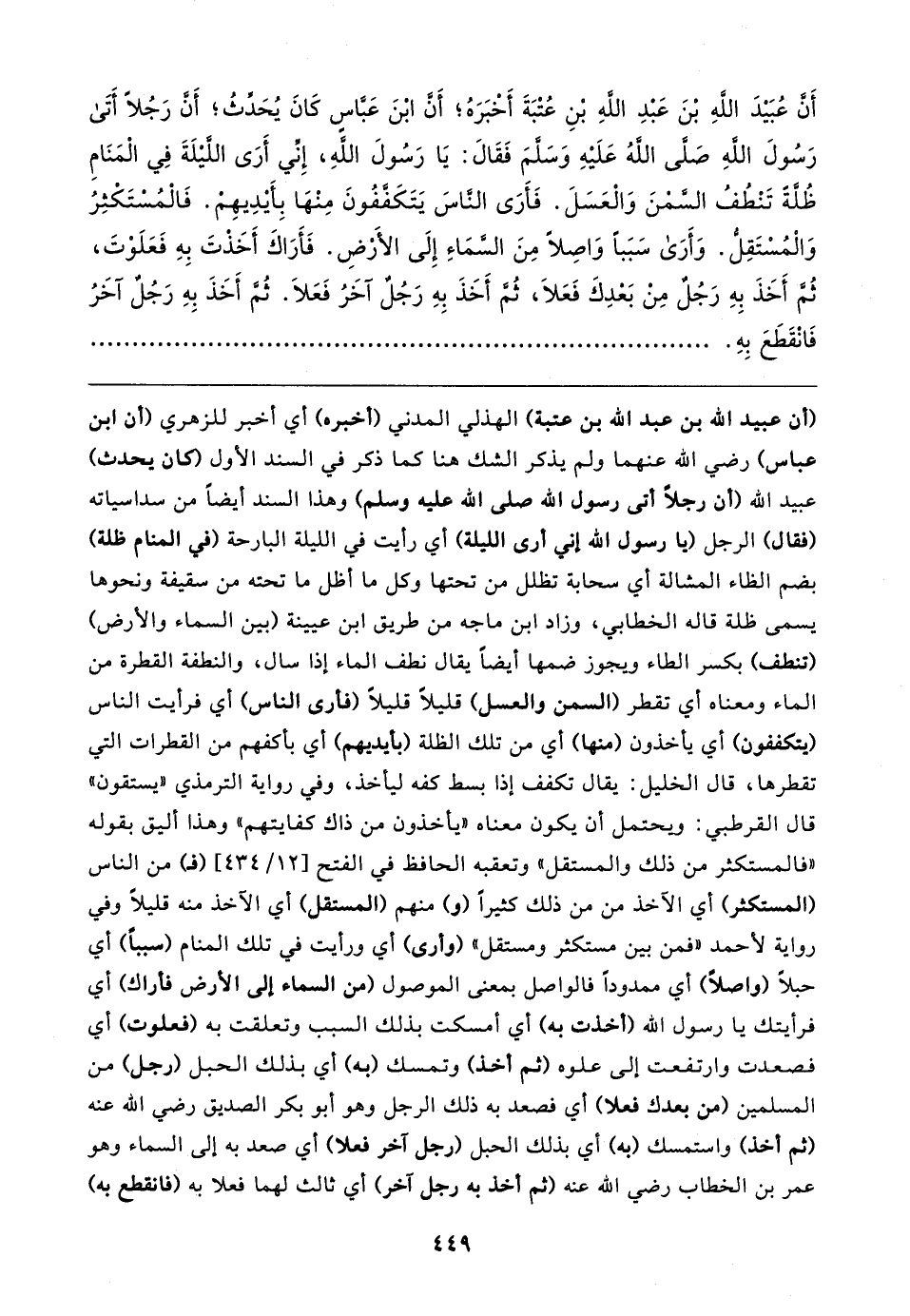أَنَّ عُبَيدَ اللَّهِ بْنَ عَبْدِ اللَّهِ بْنِ عُتْبَةَ أَخْبَرَهُ؛ أَنَّ ابْنَ عَبَّاسٍ كَانَ يُحَدِّثُ؛ أَنَّ رَجُلًا أَتَى رَسُولَ اللهِ صلى الله عليه وسلم فَقَال: يَا رَسُولَ اللهِ, إِنِّي أَرَى اللَّيلَةَ فِي الْمَنَامِ ظُلَّةً تَنْطِفُ السَّمْنَ وَالْعَسَلَ. فَأَرَى النَّاسَ يَتَكَفَّفُونَ مِنْهَا بِأَيدِيهِمْ. فَالْمُسْتَكْثِرُ وَالْمُسْتَقِلُّ. وَأَرَى سَبَبًا وَاصِلًا مِنَ السَّمَاءِ إِلَى الأَرْضِ. فَأَرَاكَ أَخَذْتَ بِهِ فَعَلَوْتَ, ثُمَّ أَخَذَ بِهِ رَجُلٌ مِنْ بَعْدِكَ فَعَلا, ثُمَّ أَخَذَ بِهِ رَجُلٌ آخَرُ فَعَلا. ثُمَّ أَخَذَ بِهِ رَجُلٌ آخَرُ فَانْقَطَعَ بِهِ