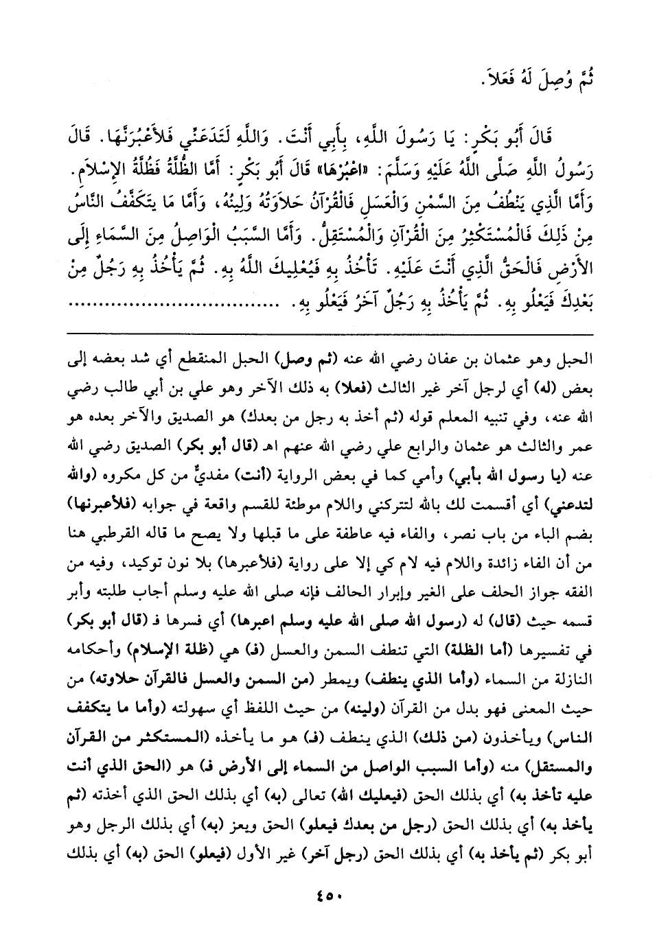 الحبل وهو عثمان بن عفان رضي الله عنه (ثم وصل) الحبل المنقطع أي شد بعضه إلى بعض (له) أي لرجل آخر غير الثالث (فعلا) به ذلك الآخر وهو علي بن أبي طالب رضي الله عنه، وفي تنبيه المعلم قوله (ثم أخذ به رجل من بعدك) هو الصديق والآخر بعده هو عمر والثالث هو عثمان والرابع علي رضي الله عنهم اهـ (قال أبو بكر) الصديق رضي الله عنه (يا رسول الله بأبي) وأمي كما في بعض الرواية (أنت) مفديٌّ من كل مكروه (والله لتدعني) أي أقسمت لك بالله لتتركني واللام موطئة للقسم واقعة في جوابه (فلأعبرنها) بضم الباء من باب نصر، والفاء فيه عاطفة على ما قبلها ولا يصح ما قاله القرطبي هنا من أن الفاء زائدة واللام فيه لام كي إلا على رواية (فلأعبرها) بلا نون توكيد، وفيه من الفقه جواز الحلف على الغير وإبرار الحالف فإنه صلى الله عليه وسلم أجاب طلبته وأبر قسمه حيث (قال) له (رسول الله صلى الله عليه وسلم اعبرها) أي فسرها فـ (قال أبو بكر) في تفسيرها (أما الظلة) التي تنطف السمن والعسل (فـ) هي (ظلة الإسلام) وأحكامه النازلة من السماء (وأما الذي ينطف) ويمطر (من السمن والعسل فالقرآن حلاوته) من حيث المعنى فهو بدل من القرآن (ولينه) من حيث اللفظ أي سهولته (وأما ما يتكفف الناس) ويأخذون (من ذلك) الذي ينطف (فـ) هو ما يأخذه (المستكثر من القرآن والمستقل) منه (وأما السبب الواصل من السماء إلى الأرض فـ) هو (الحق الذي أنت عليه تأخذ به) أي بذلك الحق (فيعليك الله) تعالى (به) أي بذلك الحق الذي أخذته (ثم يأخذ به) أي بذلك الحق (رجل من بعدك فيعلو) الحق ويعز (به) أي بذلك الرجل وهو أبو بكر (ثم يأخذ به) أي بذلك الحق (رجل آخر) غير الأول (فيعلو) الحق (به) أي بذلك