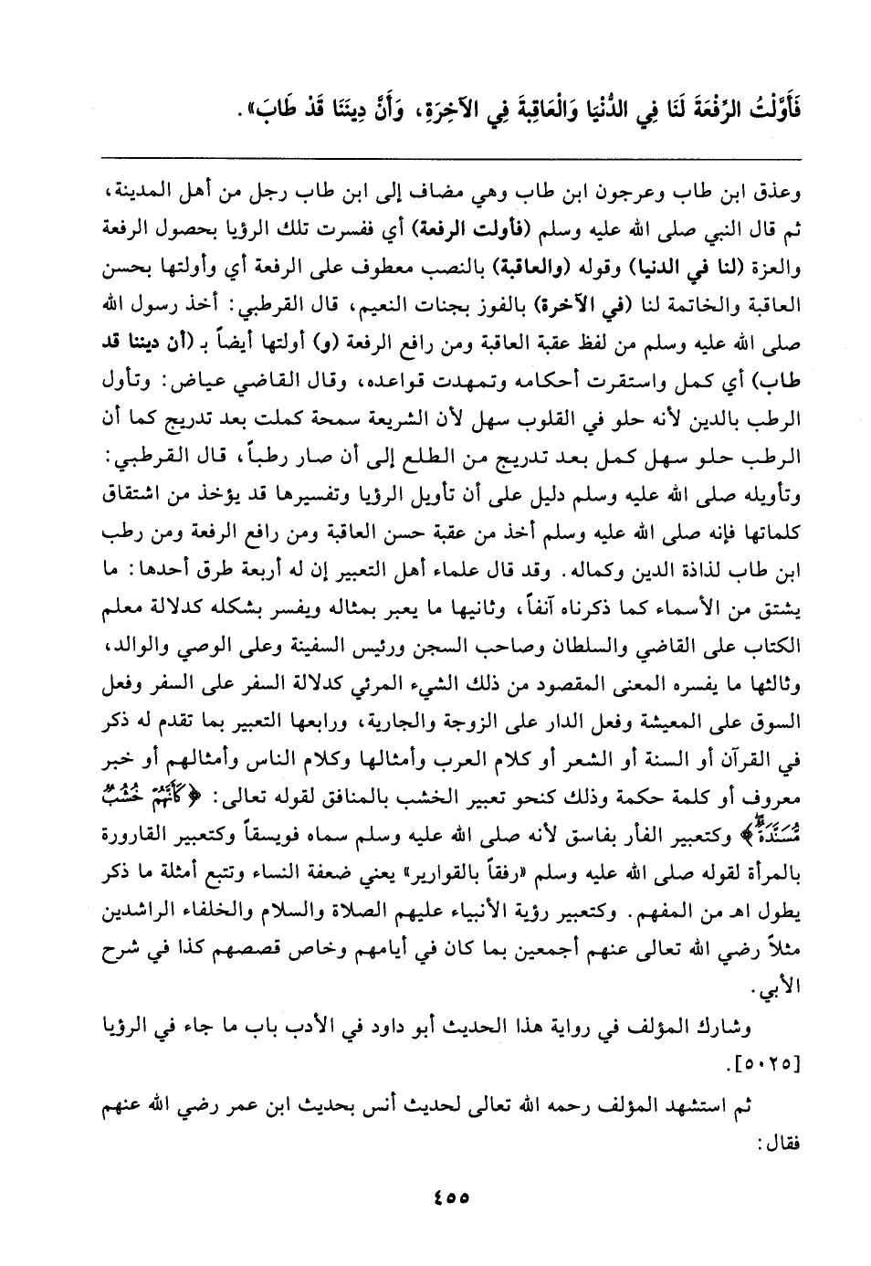 فَأَوَّلْتُ الرِّفْعَةَ لَنَا فِي الدُّنْيَا وَالْعَاقِبَةَ فِي الآخِرَةِ, وَأَنَّ دِينَنَا قَدْ طَابَ"