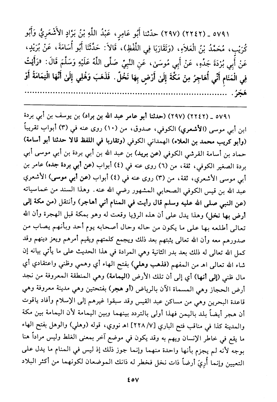 ٥٧٩١ - (٢٢٤٢) (٢٩٧) (حدثنا أبو عامر عبد الله بن براد) بن يوسف بن أبي بردة بن أبي موسى (الأشعري) الكوفي، صدوق، من (١٠) روى عنه في (٣) أبواب تقريبًا (وأبو كريب محمد بن العلاء) الهمداني الكوفي (وتقاربا في اللفظ قالا حدثنا أبو أسامة) حماد بن أسامة القرشي الكوفي (عن بريد) بن عبد الله بن أبي بردة بن أبي موسى أبي بردة الصغير الكوفي، ثقة، من (٦) روى عنه في (٤) أبواب (عن أبي بردة جده) عامر بن أبي موسى الأشعري، ثقة، من (٣) روى عنه في (٤) أبواب (عن أبي موسى) الأشعري عبد الله بن قيس الكوفي الصحابي المشهور رضي الله عنه. وهذا السند من خماسياته (عن النبي صلى الله عليه وسلم قال رأيت في المنام أني أهاجر) وأنتقل (من مكة إلى أرض بها نخل) وهذا يدل على أن هذه الرؤيا وقعت له وهو بمكة قبل الهجرة وأن الله تعالى أطلعه بها على ما يكون من حاله وحال أصحابه يوم أحد وبأنهم يصاب من صدورهم معه وأن الله تعالى يثبتهم بعد ذلك ويجمع كلمتهم ويقيم أمرهم ويعز دينهم وقد كمل الله تعالى له ذلك بعد بدر الثانية وهي المرادة في هذا الحديث على ما يأتي بيانه إن شاء الله تعالى اهـ من المفهم (فذهب وهلي) بفتح الهاء أي وهمي وظني واعتقادي أي مال ظني (إلى أنها) أي إلى أن تلك الأرض (اليمامة) وهي المنطقة المعروفة من نجد أرض الحجاز وهي المسماة الآن بالرياض (أو هجر) بفتحتين وهي مدينة معروفة وهي قاعدة البحرين وهي من مساكن عبد القيس وقد سبقوا غيرهم إلى الإسلام وأفاد ياقوت أن هجر أيضًا بلد باليمن فهذا أولى بالتردد بينهما وبين اليمامة لأن اليمامة بين مكة والمدينة كذا في مناقب فتح الباري [٧/ ٢٢٨] اهـ نووي، قوله (وهلي) والوهل بفتح الهاء ما يقع في خاطر الإنسان ويهم به وقد يكون في موضع آخر بمعنى الغلط وليس مرادًا هنا بوجه لأنه لم يجزم بأنها واحدة منهما وإنما جوز ذلك إذ ليس في المنام ما يدل على التعيين وإنما أُرِيَ أرضًا ذات نخل فخطر له ذانك الموضعان لكونهما من أكثر البلاد