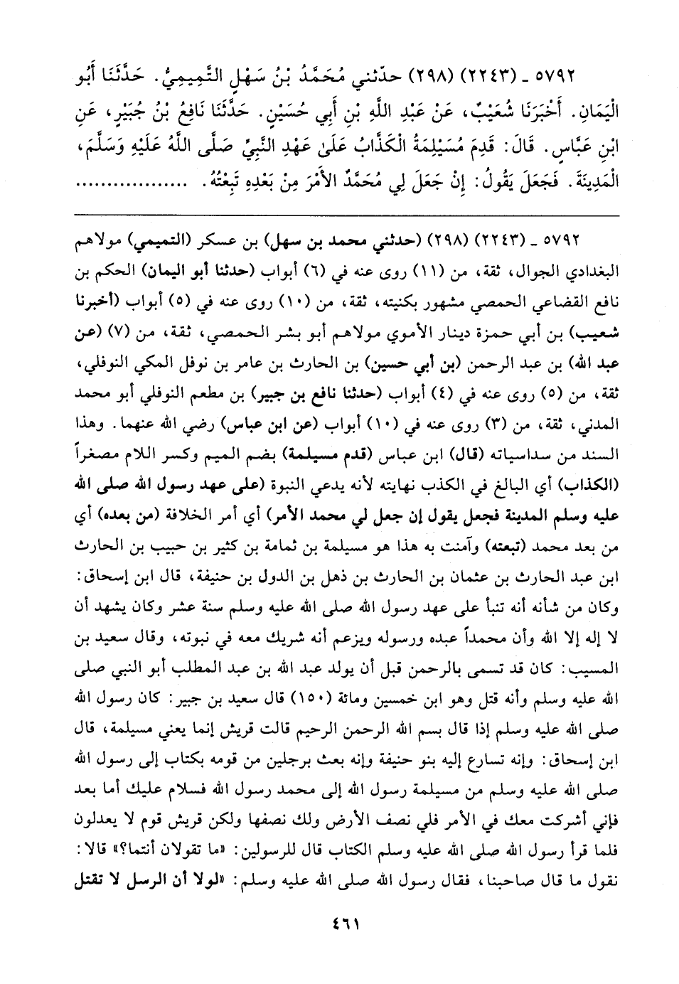 ٥٧٩٢ - (٢٢٤٣) (٢٩٨) حَدَّثَنِي مُحَمَّدُ بْنُ سَهْلٍ التَّمِيمِيُّ. حَدَّثَنَا أَبُو الْيَمَانِ. أَخْبَرَنَا شُعَيبٌ، عَنْ عَبْدِ اللَّهِ بْنِ أَبِي حُسَينٍ. حَدَّثَنَا نَافِعُ بْنُ جُبَيرٍ، عَنِ ابْنِ عَبَّاسٍ. قَال: قَدِمَ مُسَيلِمَةُ الْكَذَّابُ عَلَى عَهْدِ النَّبِيِّ صلى الله عليه وسلم, الْمَدِينَةَ. فَجَعَلَ يَقُولُ: إِنْ جَعَلَ لِي مُحَمَّدٌ الأَمْرَ مِنْ بَعْدِهِ تَبِعْتُهُ