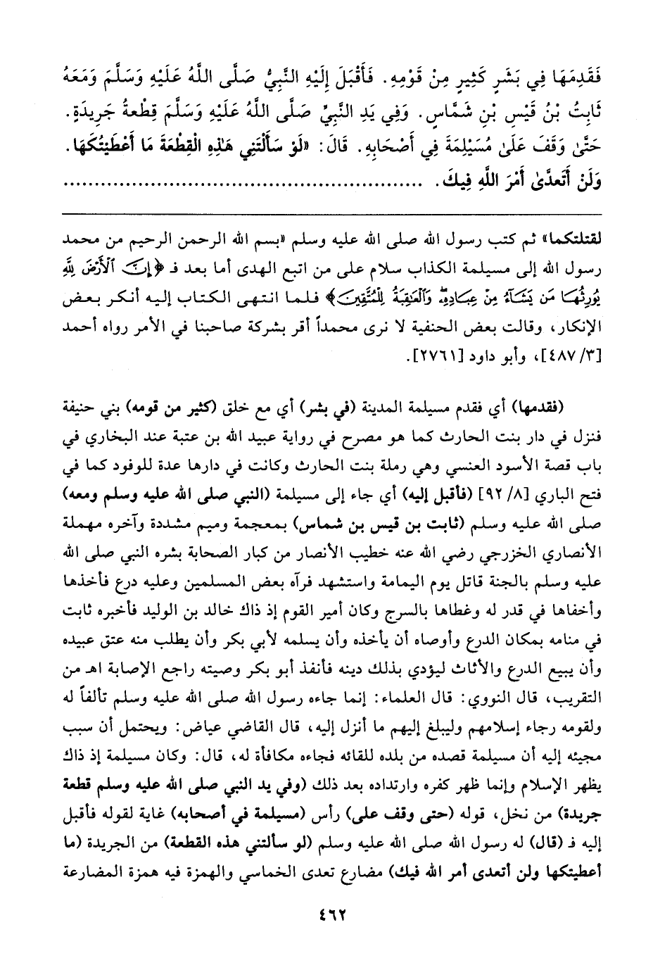 لقتلتكما" ثم كتب رسول الله صلى الله عليه وسلم "بسم الله الرحمن الرحيم من محمد رسول الله إلى مسيلمة الكذاب سلام على من اتبع الهدى أما بعد فـ {إِنَّ الْأَرْضَ لِلَّهِ يُورِثُهَا مَنْ يَشَاءُ مِنْ عِبَادِهِ وَالْعَاقِبَةُ لِلْمُتَّقِينَ} فلما انتهى الكتاب إليه أنكر بعض الإنكار، وقالت بعض الحنفية لا نرى محمدًا أقر بشركة صاحبنا في الأمر رواه أحمد [٣/ ٤٨٧]، وأبو داود [٢٧٦١].