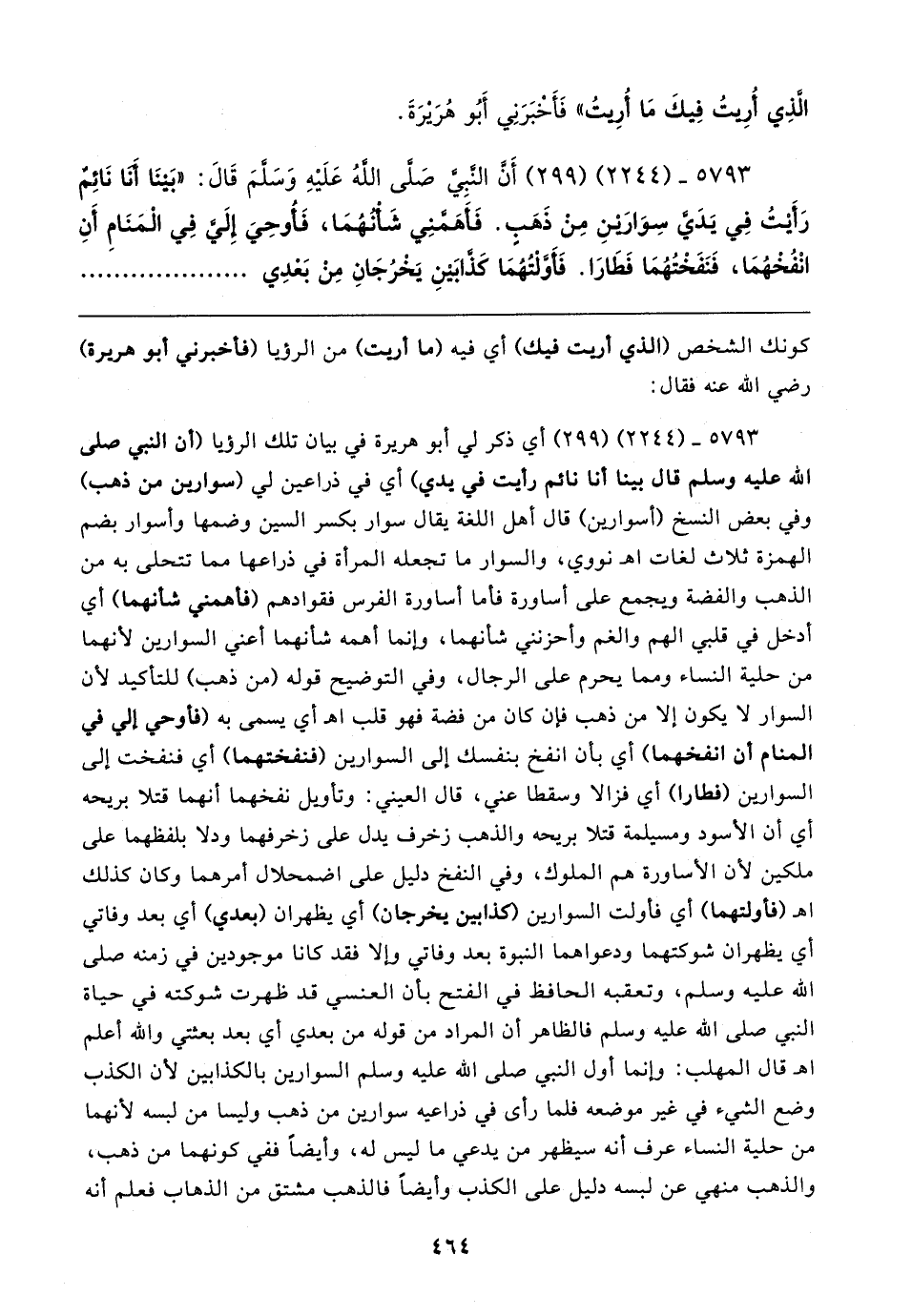 ٥٧٩٣ - (٢٢٤٤) (٢٩٩) أَنَّ النَّبِيَّ صلى الله عليه وسلم قَال: "بَينَا أَنَا نَائِمٌ رَأَيتُ فِي يَدَيَّ سِوَارَينِ مِنْ ذَهَبٍ. فَأَهَمَّنِي شَأْنُهُمَا, فَأُوحِيَ إِلَيَّ فِي الْمَنَامِ أَنِ انْفُخْهُمَا فَنَفَخْتُهُمَا فَطَارَا. فَأَوَّلْتُهُمَا كَذَّابَينِ يَخْرُجَانِ مِنْ بَعْدِي