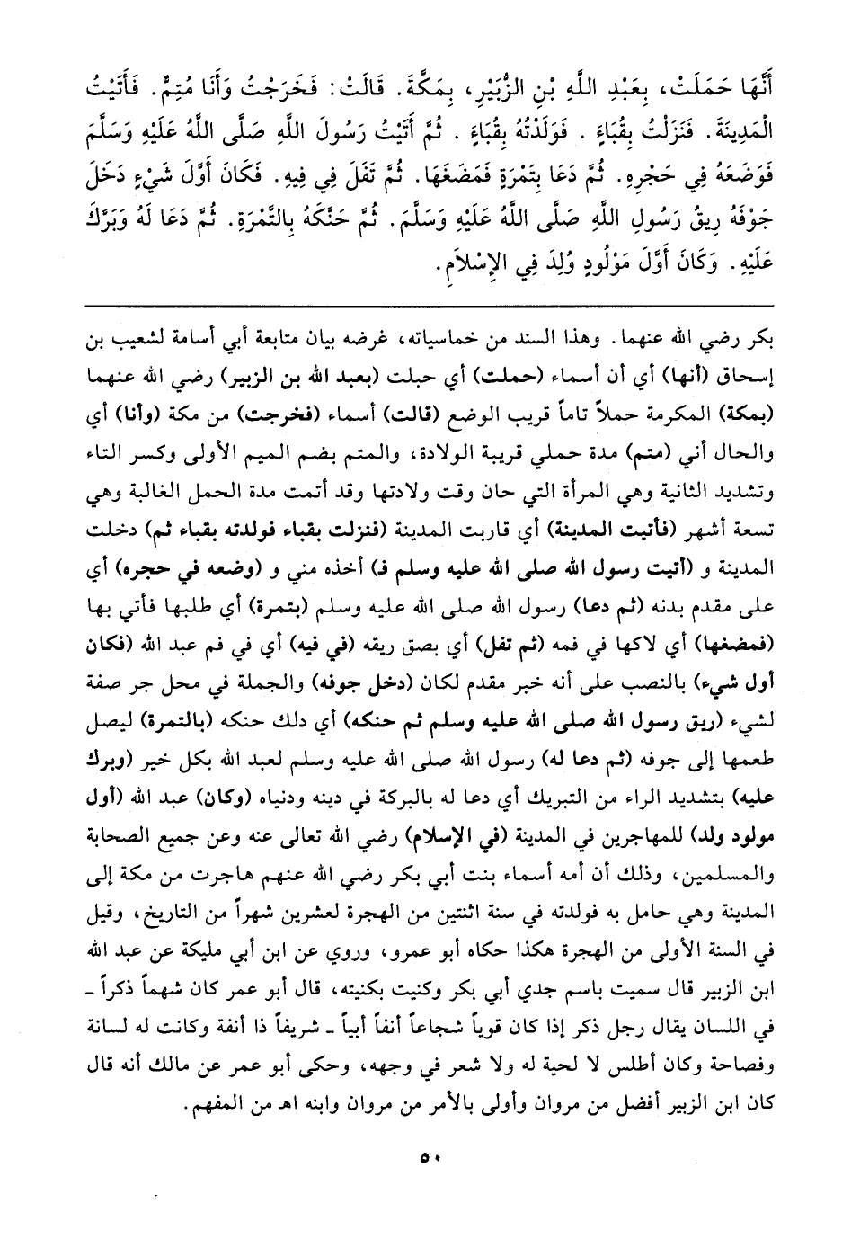 بكر رضي الله عنهما. وهذا السند من خماسياته، غرضه بيان متابعة أبي أسامة لشعيب بن إسحاق (أنها) أي أن أسماء (حملت) أي حبلت (بعبد الله بن الزبير) رضي الله عنهما (بمكة) المكرمة حملًا تامًّا قريب الوضع (قالت) أسماء (فخرجت) من مكة (وأنا) أي والحال أني (متم) مدة حملي قويبة الولادة، والمتم بضم الميم الأولى وكسر التاء وتشديد الثانية وهي المرأة التي كان وقت ولادتها وقد أتمت مدة الحمل الغالبة وهي تسعة أشهر (فأتيت المدينة) أي قاربت المدينة (فنزلت بقباء فولدته بقباء ثم) دخلت المدينة و (أتيت رسول الله صلى الله عليه وسلم فـ) أخذه مني و (وضعه في حجره) أي على مقدم بدنه (ثم دعا) رسول الله صلى الله عليه وسلم (بتمرة) أي طلبها فأتى بها (فمضغها) أي لاكها في فمه (ثم تفل) أي بصق ريقه (في فيه) أي في فم عبد الله (فكان أول شيء) بالنصب على أنه خبر مقدم لكان (دخل جوفه) والجملة في محل جر صفة لشيء (ريق رسول الله صلى الله عليه وسلم ثم حنكه) أي دلك حنكه (بالتمرة) ليصل طعمها إلى جوفه (ثم دعا له) رسول الله صلى الله عليه وسلم لعبد الله بكل خير (وبرك عليه) بتشديد الراء من التبريك أي دعا له بالبركة في دينه ودنياه (وكان) عبد الله (أول مولود ولد) للمهاجرين في المدينة (في الإسلام) رضي الله تعالى عنه وعن جميع الصحابة والمسلمين، وذلك أن أمه أسماء بنت أبي بكر رضي الله عنهم هاجرت من مكة إلى المدينة وهي حامل به فولدته في سنة اثنتين من الهجرة لعشرين شهرًا من التاريخ، وقيل في السنة الأولى من الهجرة هكذا حكاه أبو عمرو، وروي عن ابن أبي مليكة عن عبد الله بن الزبير قال سميت باسم جدي أبي بكر وكنيت بكنيته، قال أبو عمر كان شهمًا ذكرًا -في اللسان يقال رجل ذكر إذا كان قويًّا شجاعًا أنفًا أبيًا- شريفًا ذا أنفة وكانت له لسانة وفصاحة وكان أطلس لا لحية له ولا شعر في وجهه، وحكى أبو عمر عن مالك أنه قال كان ابن الزبير أفضل من مروان وأولى بالأمر من مروان وابنه اهـ من المفهم.