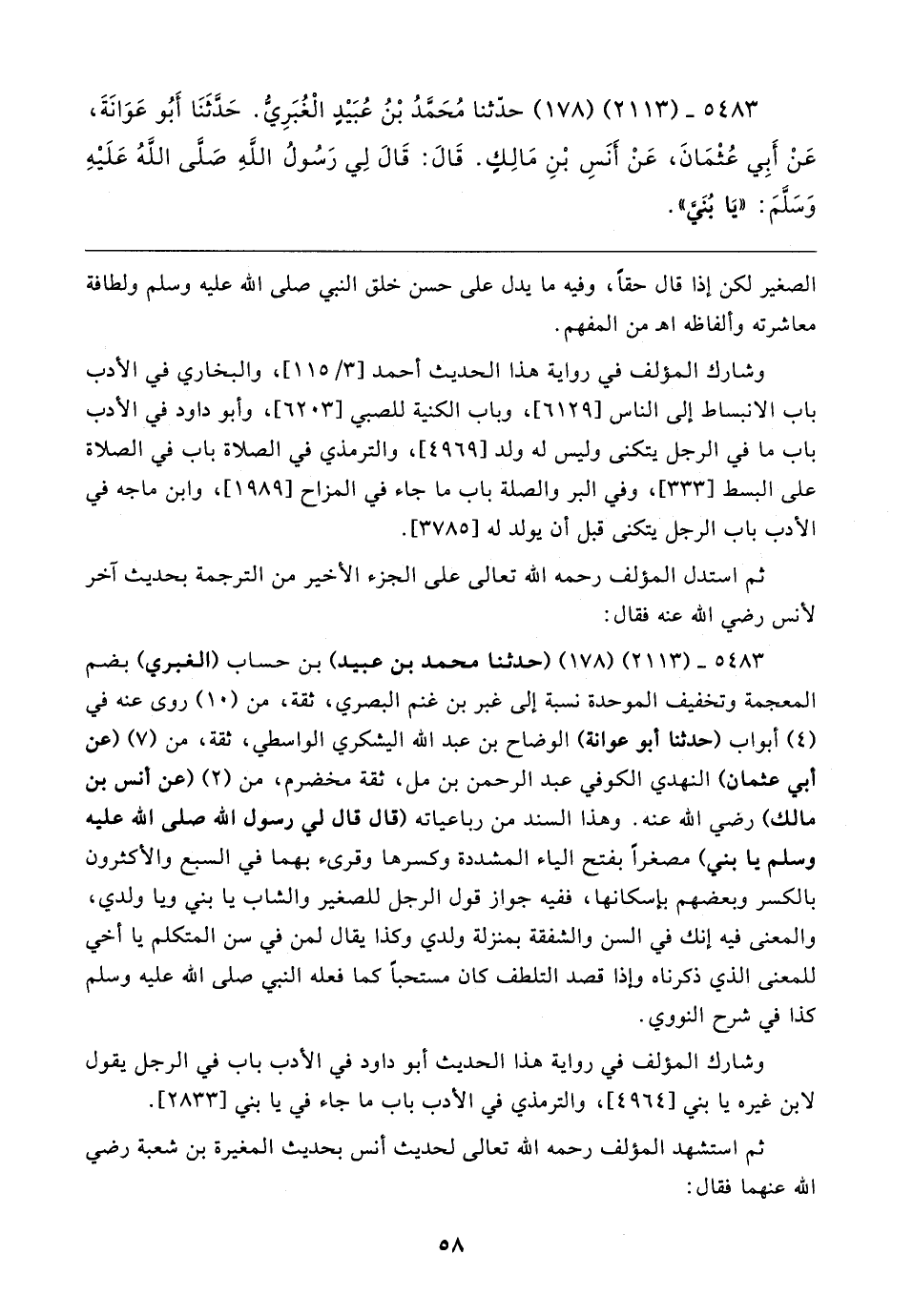 ٥٤٨٣ - (٢١١٣) (١٧٨) حدثنا مُحَمَّدُ بْنُ عُبَيدٍ الْغُبَريُّ. حَدَّثَنَا أَبُو عَوَانَةَ، عَنْ أَبِي عُثْمَانَ، عَنْ أَنَسِ بْنِ مَالِكٍ. قَال: قَال لِي رَسُولُ الله صَلَّى اللهُ عَلَيهِ وَسَلمَ: "يَا بُني"