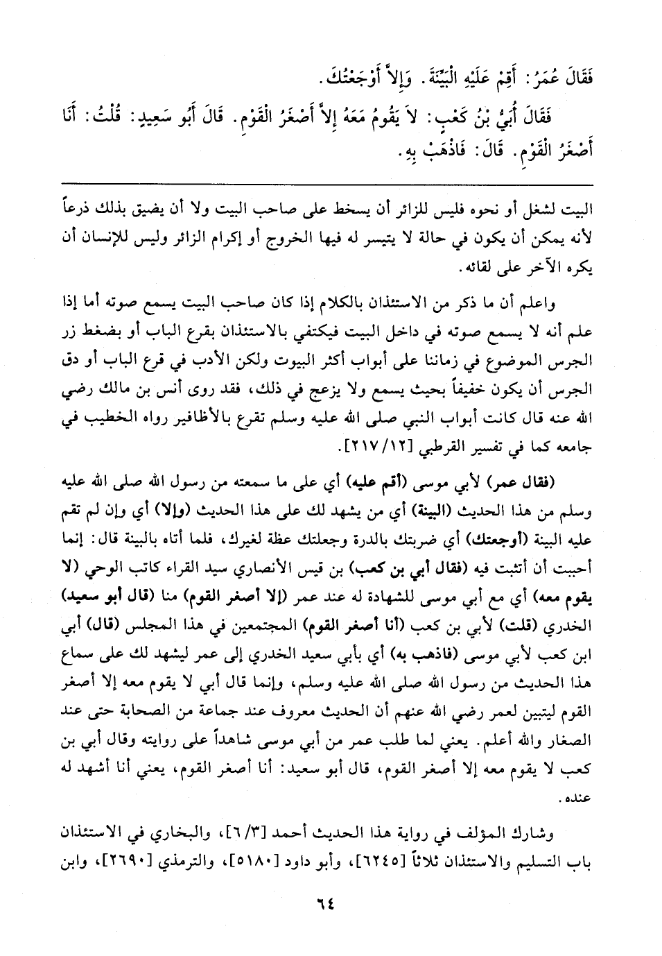 (فقال عمر) لأبي موسى (أقم عليه) أي على ما سمعته من رسول الله صلى الله عليه وسلم من هذا الحديث (البينة) أي من يشهد لك على هذا الحديث (وإلا) أي وإن لم تقم عليه البينة (أوجعتك) أي ضربتك بالدرة وجعلتك عظة لغيرك، فلما أتاه بالبينة قال: إنما أحببت أن أتثبت فيه (فقال أبي بن كعب) بن قيس الأنصاري سيد القراء كاتب الوحي إلا يقوم معه) أي مع أبي موسى للشهادة له عند عمر (إلا أصغر القوم) منا (قال أبو سعيد) الخدري (قلت) لأبي بن كعب (أنا أصغر القوم) المجتمعين في هذا المجلس (قال) أبي بن كعب لأبي موسى (فاذهب به) أي بأبي سعيد الخدري إلى عمر ليشهد لك على سماع هذا الحديث من رسول الله صلى الله عليه وسلم، وإنما قال أبي لا يقوم معه إلا أصغر القوم ليتبين لعمر رضي الله عنهم أن الحديث معروف عند جماعة من الصحابة حتى عند الصغار والله أعلم. يعني لما طلب عمر من أبي موسى شاهدًا على روايته وقال أبي بن كعب لا يقوم معه إلا أصغر القوم، قال أبو سعيد: أنا أصغر القوم، يعني أنا أشهد له عنده.