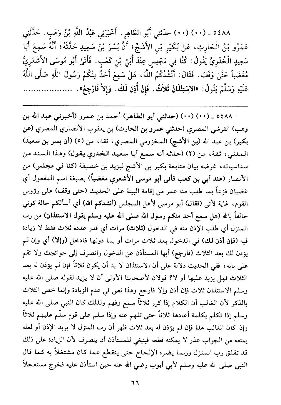 ٥٤٨٨ - (٠٠) (٠٠) حدَّثني أبُو الطَّاهِرِ. أَخْبَرَنِي عَبْدُ اللَّهِ بْنُ وَهْبٍ. حَدَّثَنِي عَمْرُو بْنُ الْحَارِثِ، عَنْ بُكَيرِ بْنِ الأشَجِّ؛ أن بُسْرَ بْنَ سَعِيدٍ حَدَّثَهُ؛ أنَّهُ سمِعَ أَبَا سَعِيدٍ الْخُدْرِيَّ يَقُولُ: كُنَّا فِي مَجْلِسٍ عِنْدَ أُبَيِّ بْنِ كَعْبٍ. فَأتَى أَبُو مُوسَى الأشْعَرِيُّ مُغْضَبًا حَتَّى وَقَفَ. فَقَال: أَنْشُدُكُمُ اللهَ، هَلْ سَمِعَ أَحَدٌ مِنْكُمْ رَسُولَ اللهِ صَلَّى اللهُ عَلَيهِ وَسَلَّمَ يَقُولُ: "الاسْتئذَانُ ثَلاثٌ. فَإِنْ أُذِنَ لَكَ. وَإِلا فارْجِعْ"