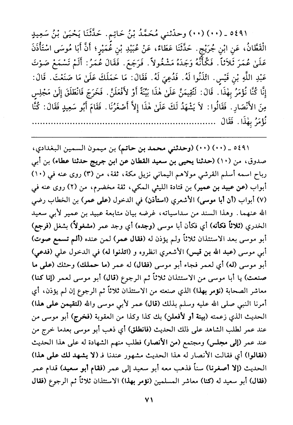 ٥٤٩١ - (٠٠) (٠٠) وَحَدَّثَنِي مُحَمَّدُ بْنُ حَاتِمٍ. حَدَّثَنَا يَحْيَى بْنُ سَعِيدٍ الْقَطَّانُ، عَنِ ابْنِ جُرَيجٍ. حَدَّثَنَا عَطَاءٌ، عَنْ عُبَيدِ بْنِ عُمَيرٍ؛ أَنَّ أَبَا مُوسَى اسْتَأْذَنَ عَلَى عُمَرَ ثَلاثًا. فَكَأَنَّهُ وَجَدَهُ مَشْغُولًا. فَرَجَعَ. فَقَال عُمَرُ: أَلَمْ تَسْمَعْ صَوْتَ عَبْدِ اللَّهِ بْنِ قَيسٍ. ائْذَنُوا لَهُ. فَدُعِيَ لَهُ. فَقَال: مَا حَمَلَكَ عَلَى مَا صَنَعْتَ. قَال: إِنَّا كُنَّا نُؤْمَرُ بِهَذَا. قَال: لَتُقِيمَنَّ عَلَى هَذَا بَيِّنَةً أَوْ لأَفْعَلَنَّ. فَخَرَجَ فَانْطَلَقَ إِلَى مَجْلِسٍ مِنَ الأَنْصَارِ. فَقَالُوا: لَا يَشْهَدُ لَكَ عَلَى هَذَا إِلَّا أَصْغَرُنَا. فَقَامَ أَبُو سَعِيدٍ فَقَال: كُنَّا نُؤْمَرُ بِهَذَا. فَقَال