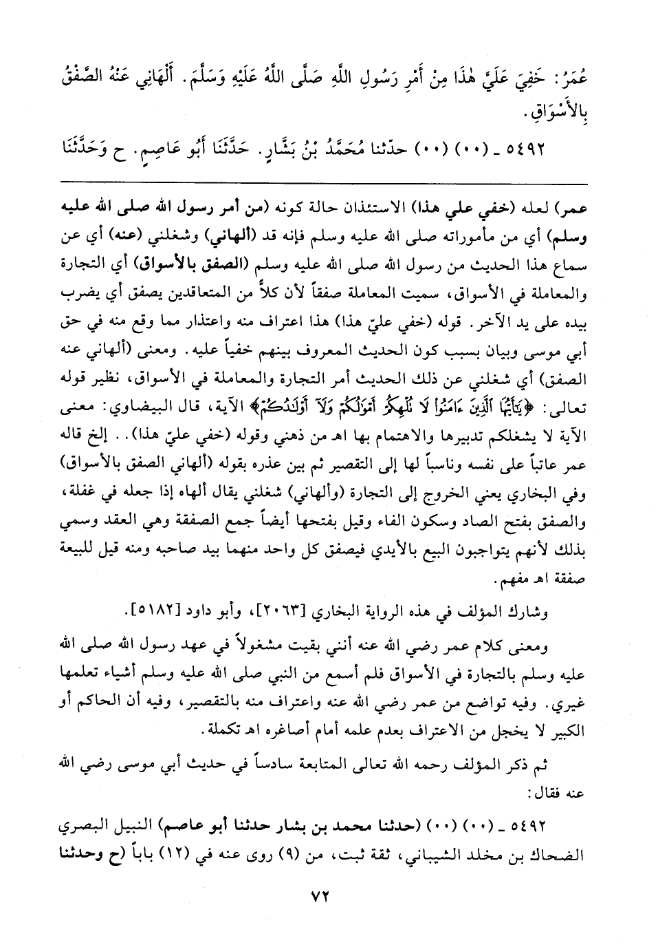عُمَرُ: خَفِيَ عَلَيَّ هَذَا مِنْ أَمْرِ رَسُولِ اللَّهِ صلى الله عليه وسلم. أَلْهَانِي عَنْهُ الصَّفْقُ بِالأَسْوَاقِ.