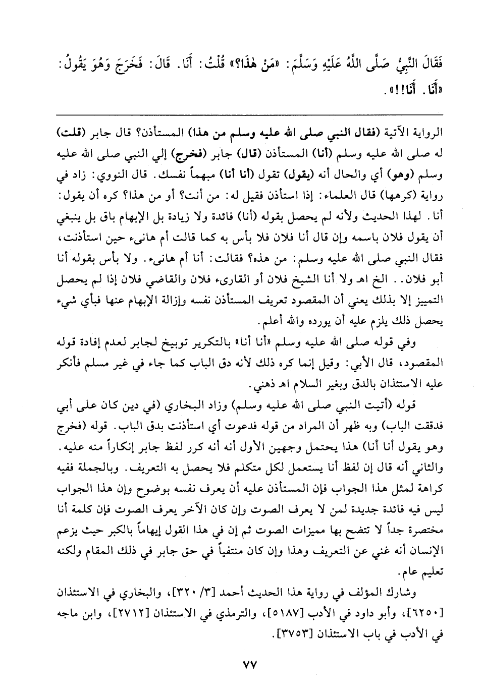 وفي قوله صلى الله عليه وسلم "أنا أنا" بالتكرير توبيخ لجابر لعدم إفادة قوله المقصود، قال الأبي: وقيل إنما كره ذلك لأنه دق الباب كما جاء في غير مسلم فأنكر عليه الاستئذان بالدق وبغير السلام اهـ ذهني.