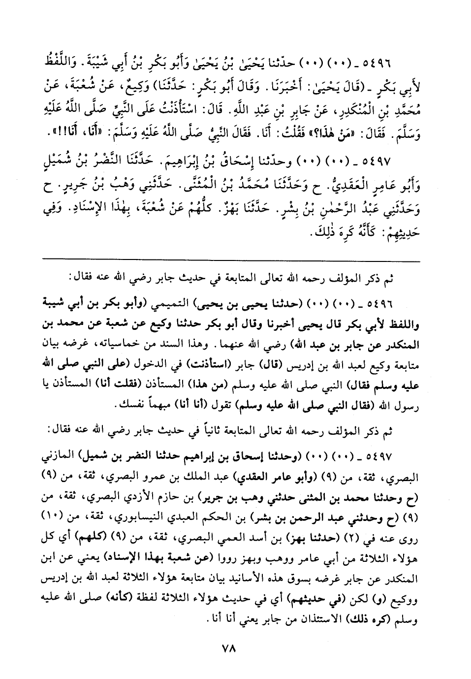 ٥٤٩٧ - (٠٠) (٠٠) (وحدثنا إسحاق بن إبراهيم حدثنا النضر بن شميل) المازني البصري، ثقة، من (٩) (وأبو عامر العقدي) عبد الملك بن عمرو البصري، ثقة، من (٩) (ح وحدثنا محمد بن المثنى حدثني وهب بن جرير) بن حازم الأزدي البصري، ثقة، من (٩) (ح وحدثني عبد الرحمن بن بشر) بن الحكم العبدي النيسابوري، ثقة، من (١٠) روى عنه في (٢) (حدثنا بهز) بن أسد العمي البصري، ثقة، من (٩) (كلهم) أي كل هؤلاء الثلاثة من أبي عامر ووهب وبهز رووا (عن شعبة بهذا الإسناد) يعني عن ابن المنكدر عن جابر غرضه بسوق هذه الأسانيد بيان متابعة هؤلاء الثلاثة لعبد الله بن إدريس ووكيع (و) لكن (في حديثهم) أي في حديث هؤلاء الثلاثة لفظة (كأنه) صلى الله عليه وسلم (كره ذلك) الاستئذان من جابر يعني أنا أنا.