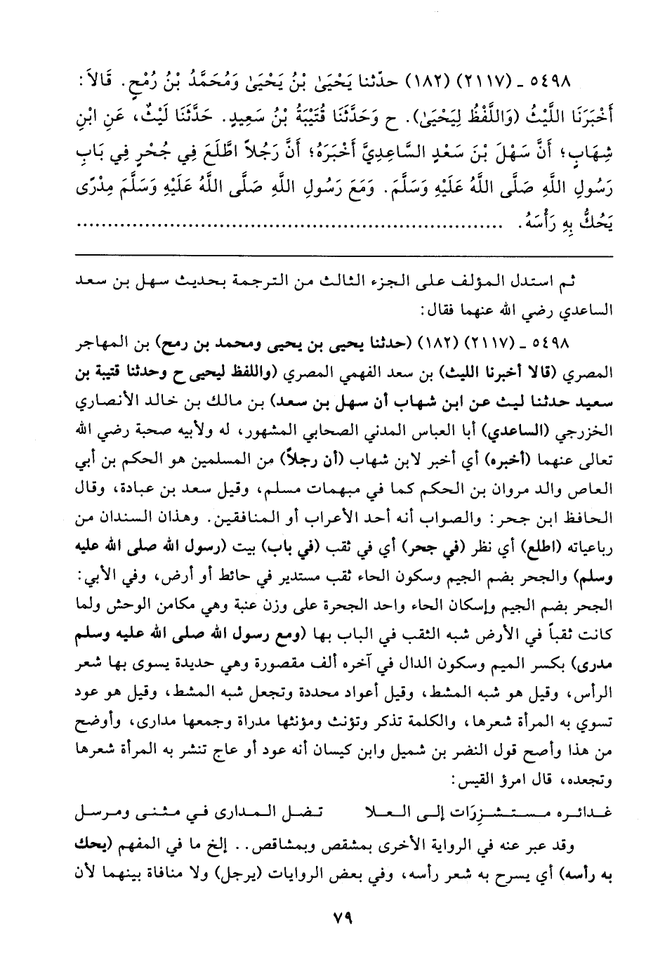 ٥٤٩٨ - (٢١١٧) (١٨٢) حَدَّثَنَا يَحْيَى بْنُ يَحْيَى وَمُحَمَّدُ بْنُ رُمْحٍ. قَالا: أَخْبَرَنَا اللَّيثُ (وَاللَّفْظُ لِيَحْيَى). ح وَحَدَّثَنَا قُتَيبَةُ بْنُ سَعِيدٍ. حَدَّثَنَا لَيثٌ، عَنِ ابْنِ شِهَابٍ؛ أَنَّ سَهْلَ بْنَ سَعْدٍ السَّاعِدِيَّ أَخْبَرَهُ؛ أَنَّ رَجُلًا اطَّلَعَ فِي جُحْرٍ فِي بَابِ رَسُولِ اللَّهِ صلى الله عليه وسلم. وَمَعَ رَسُولِ اللَّهِ صلى الله عليه وسلم مِدْرًى يَحُكُّ بِهِ رَأْسَهُ