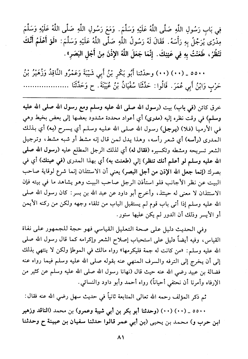 فِي بَابِ رَسُولِ اللَّهِ صلى الله عليه وسلم. وَمَعَ رَسُولِ اللَّهِ صلى الله عليه وسلم مِدْرًى يُرَجِّلُ بِهِ رَأْسَهُ. فَقَال لَهُ رَسُولُ اللهِ صلى الله عليه وسلم: "لَوْ أَعْلَمُ أَنَّكَ تَنْظُرُ, طَعَنْتُ بِهِ فِي عَينِكَ. إِنَّمَا جَعَلَ اللَّهُ الإِذْنَ مِنْ أَجْلِ الْبَصَرِ".